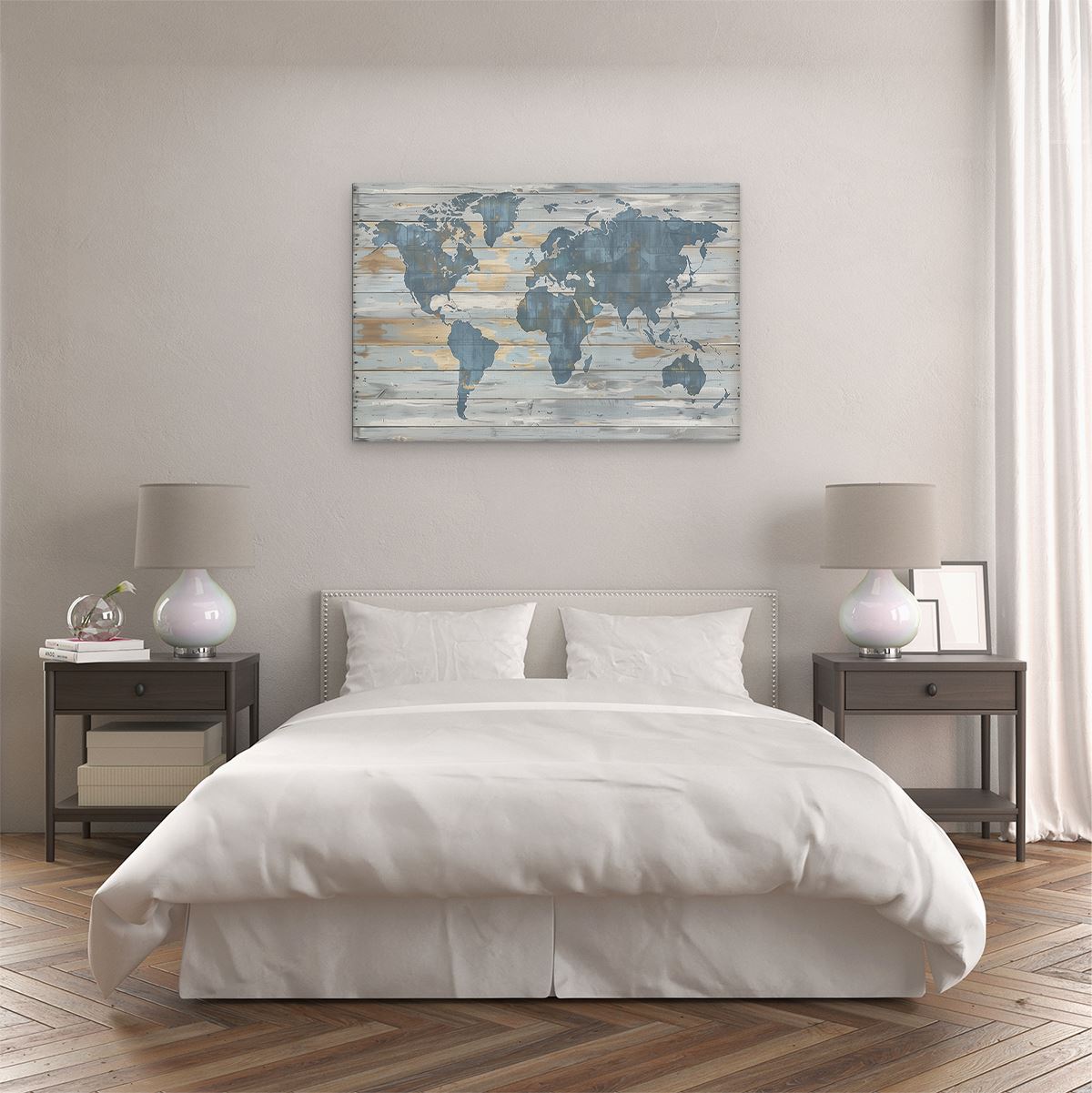 Schilderij Blauwe en Witte Wereldkaart op een Houten Plank