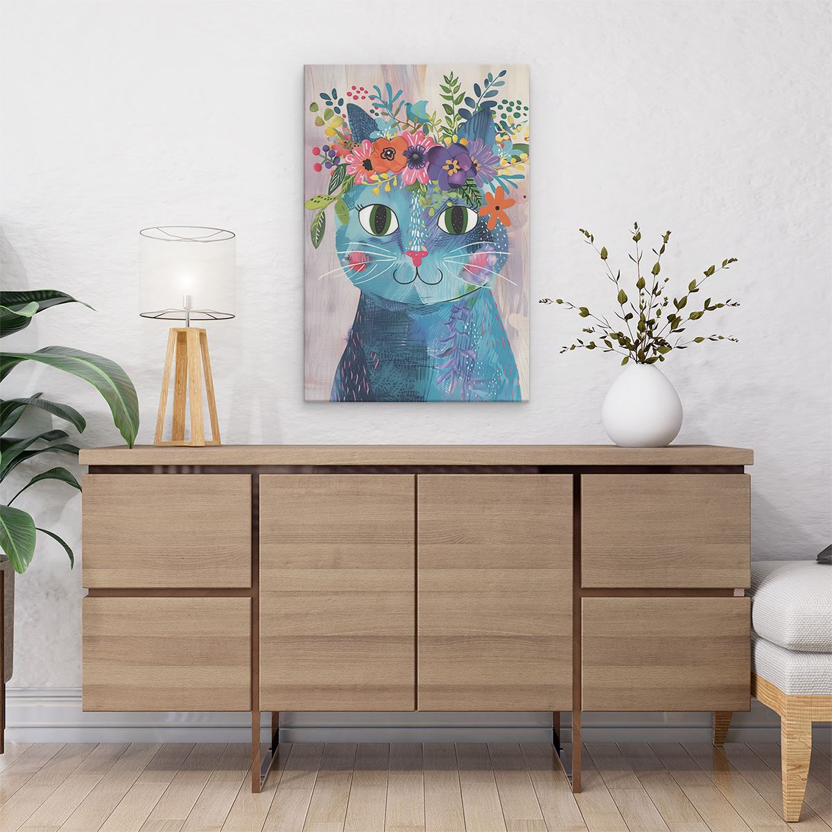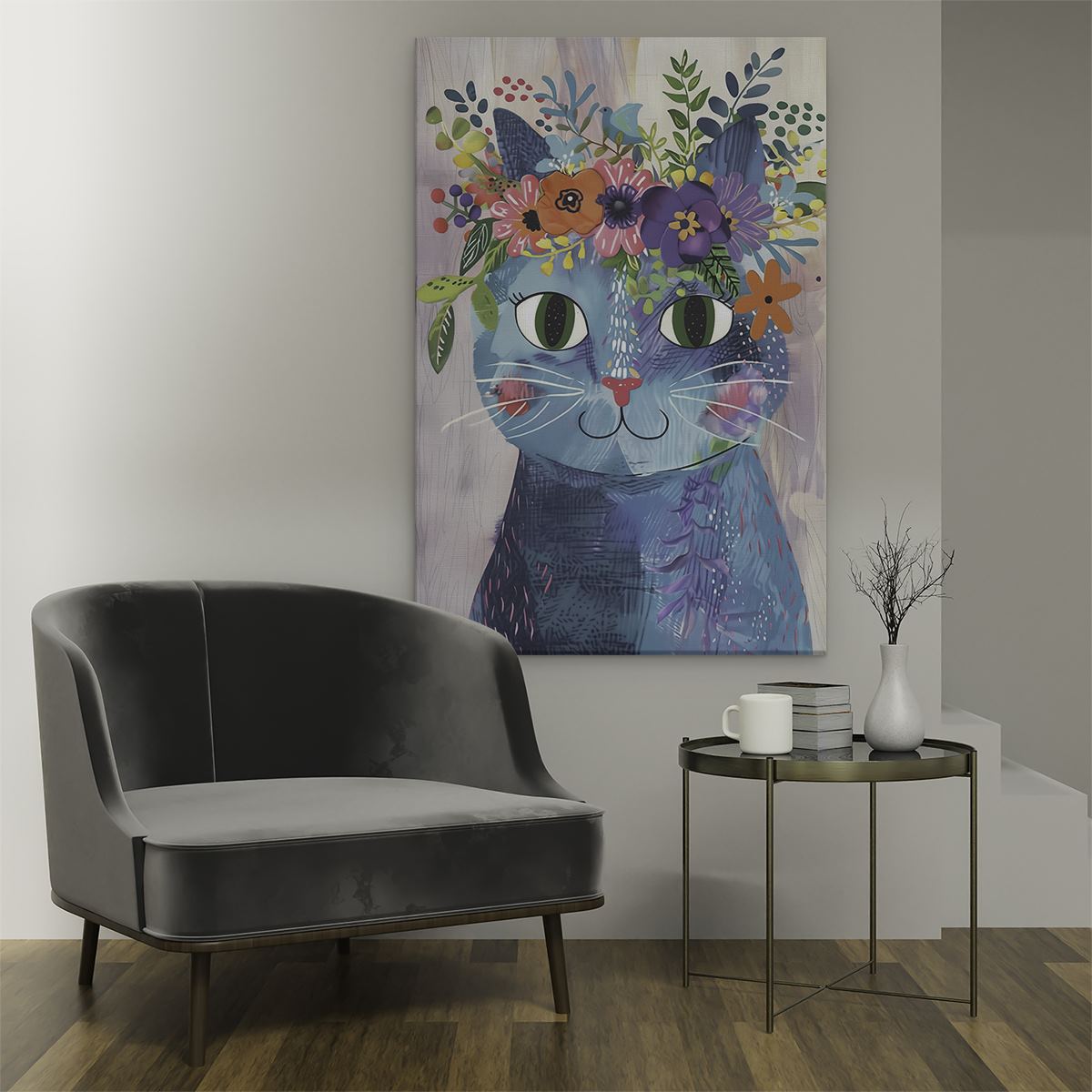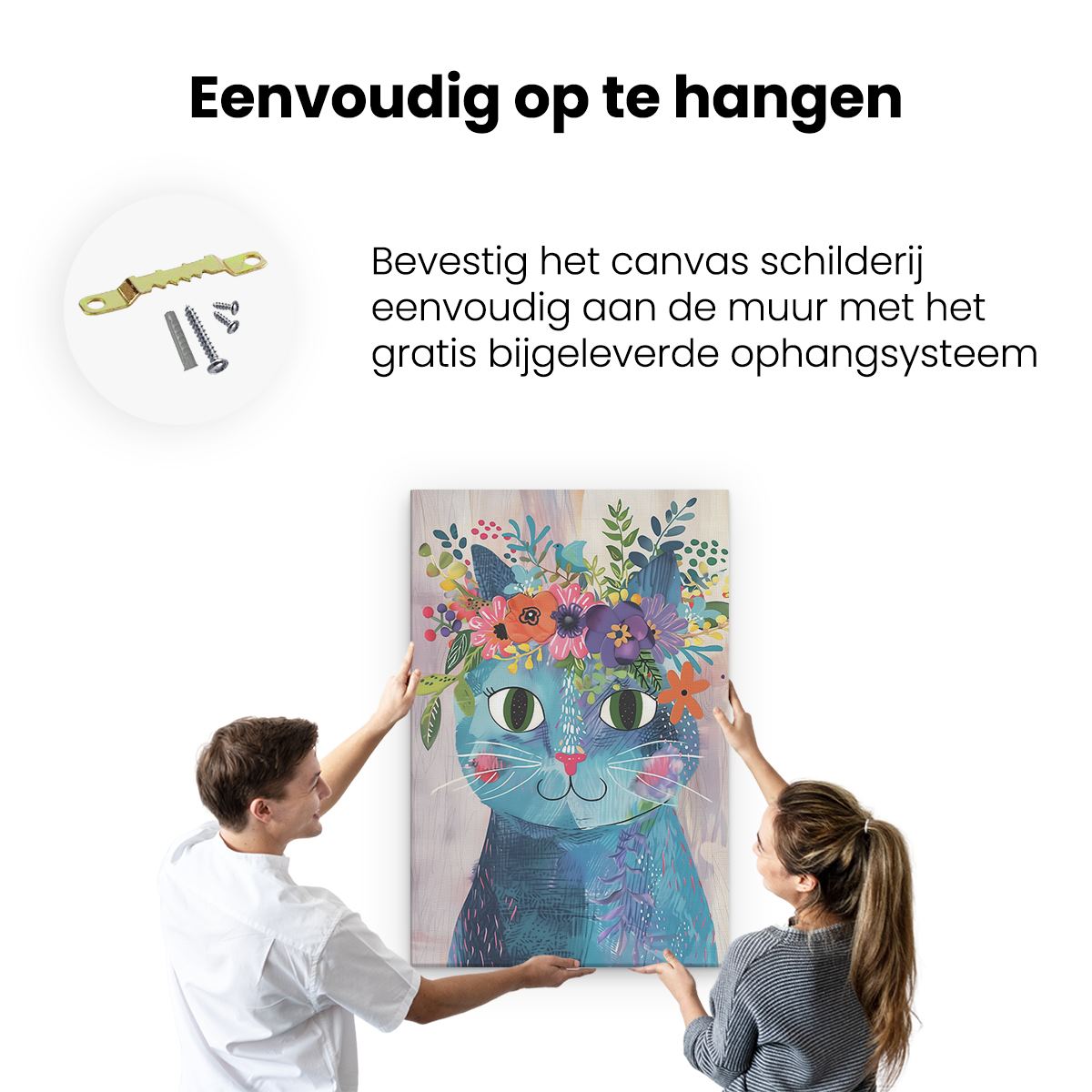 Schilderij Blauwe Kat met Bloemen op zijn Kop