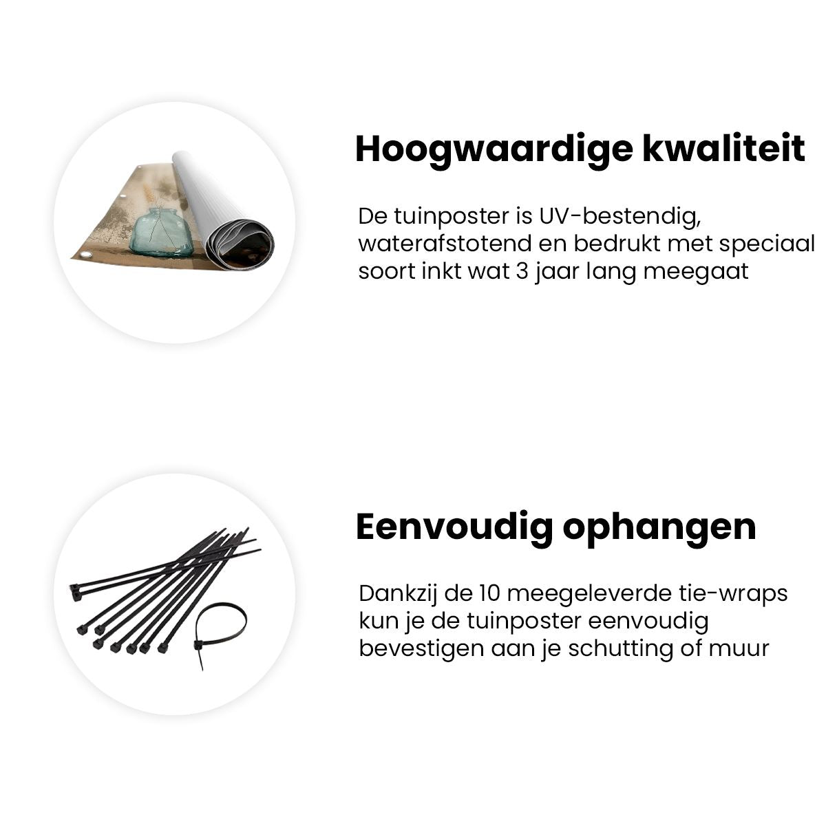 Bij aankoop ontvang je een meegeleverd ophangsysteem, zodat je op een simpele en snelle wijze de tuinposter kan ophangen.