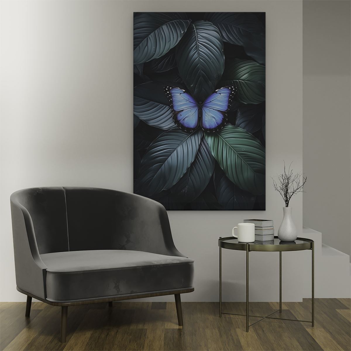 Schilderij Blauwe Vlinder Rustend op Groene Bladeren