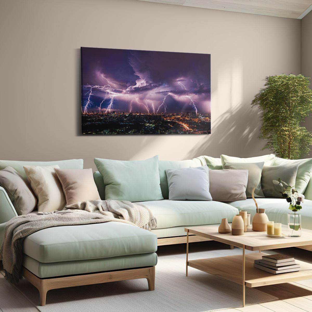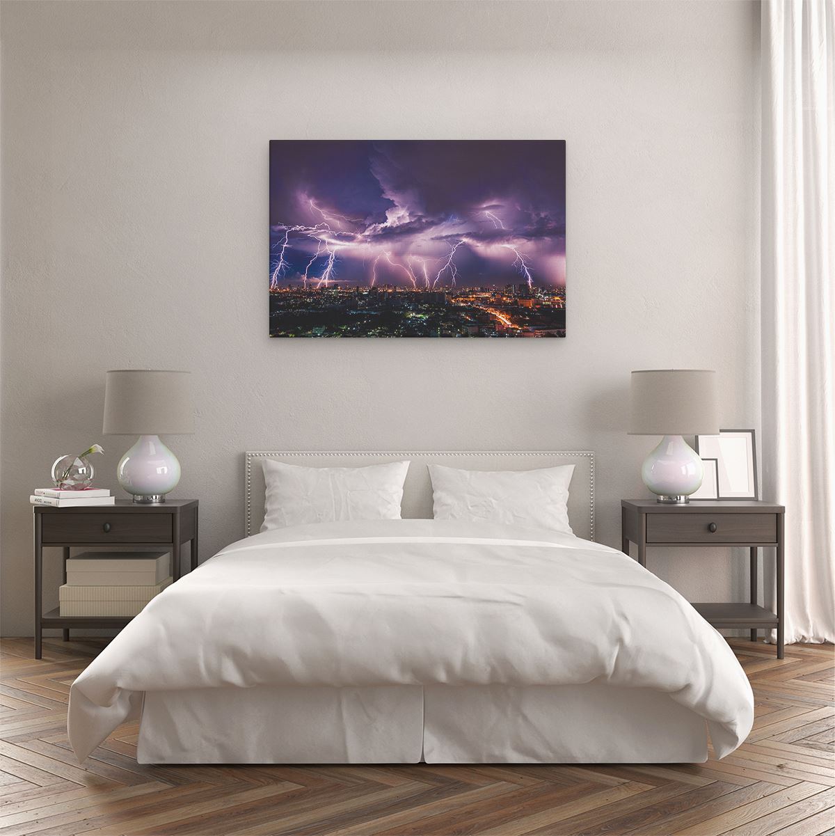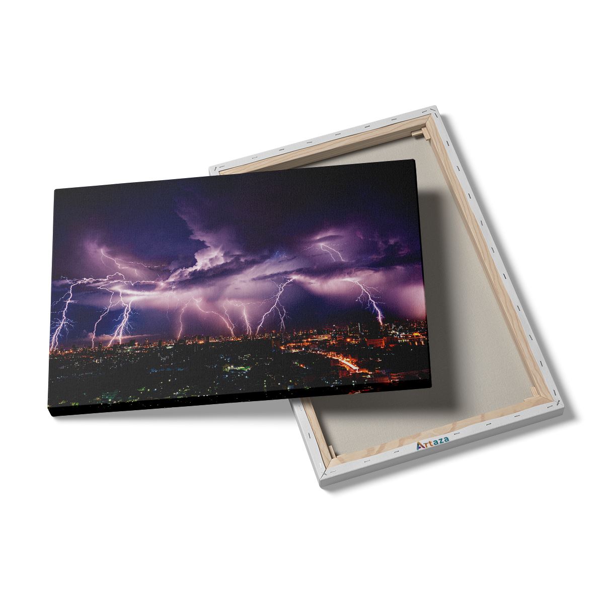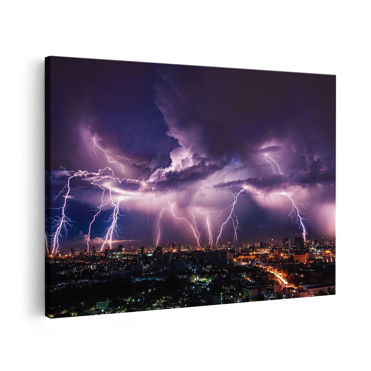 Schilderij Blikseminslag op een Stad in het Paars