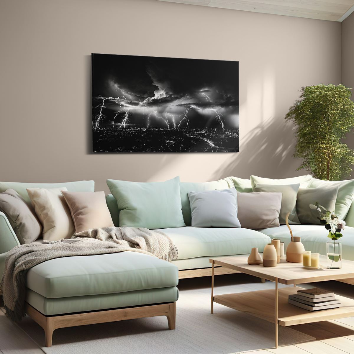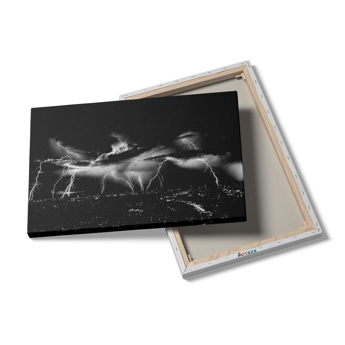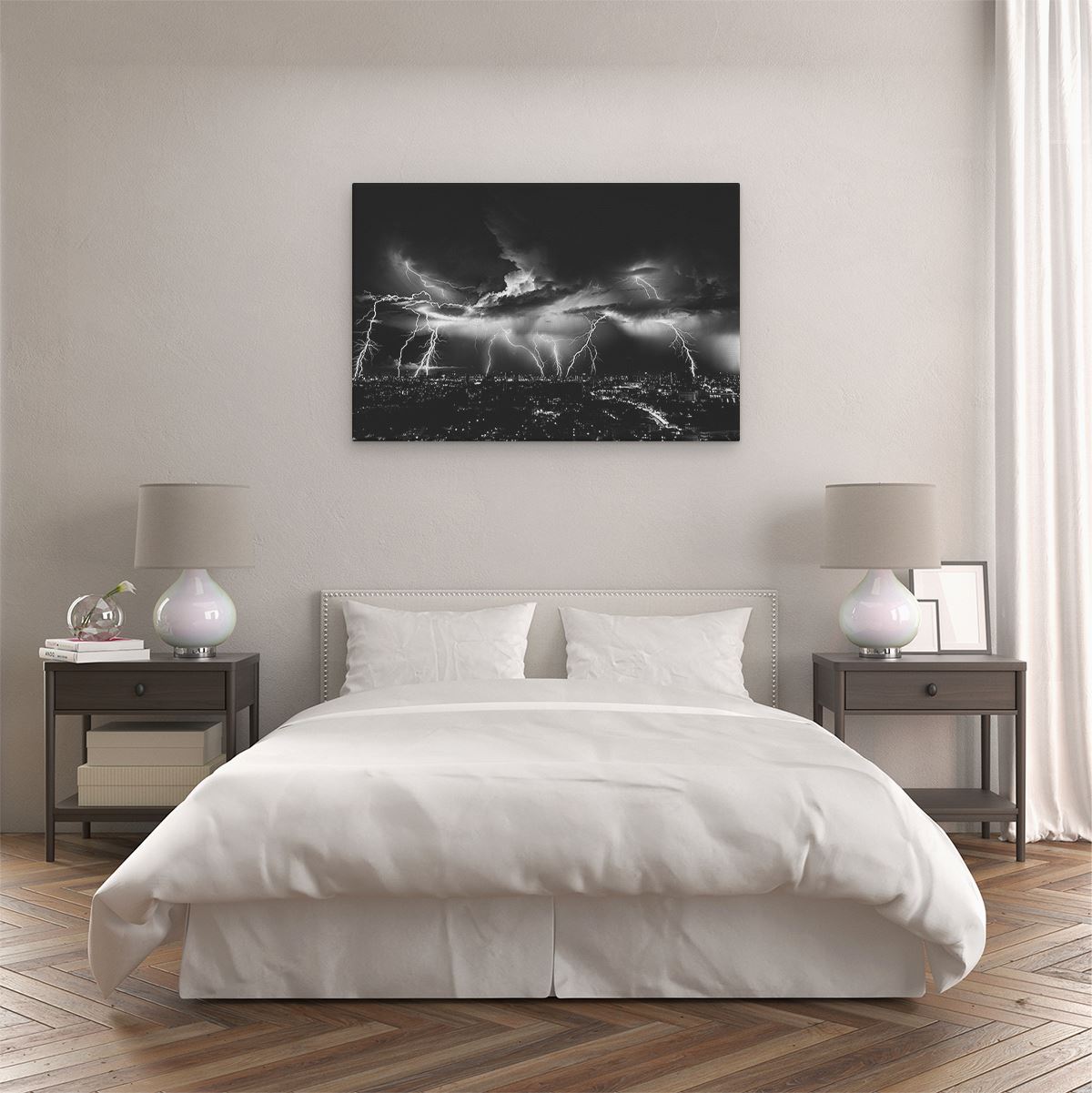 Schilderij Blikseminslag op een Stad in het Paars - Zwart Wit