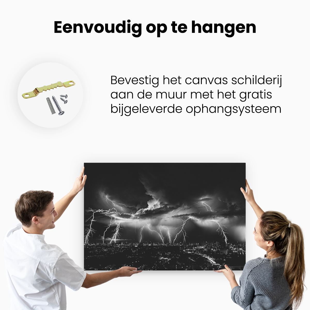 Bij aankoop ontvang je een meegeleverd ophangsysteem, zodat je op een simpele en snelle wijze het schilderij boven de bank of bed kan monteren.