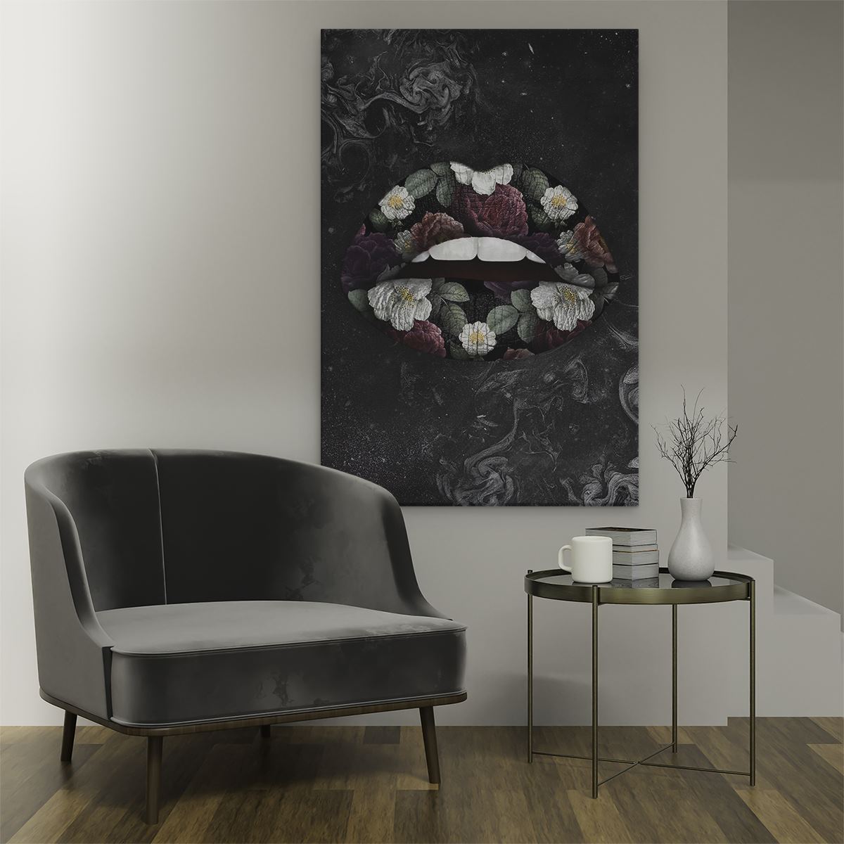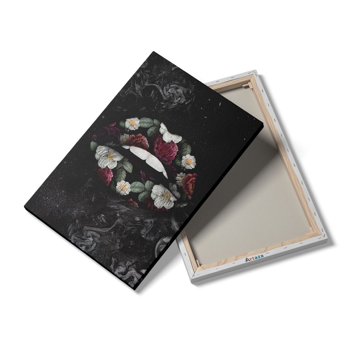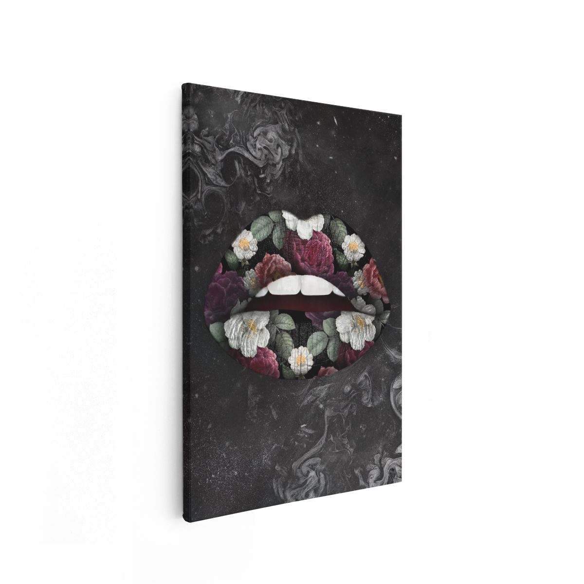Schilderij Bloemen Lippen op een Zwart Achtergrond