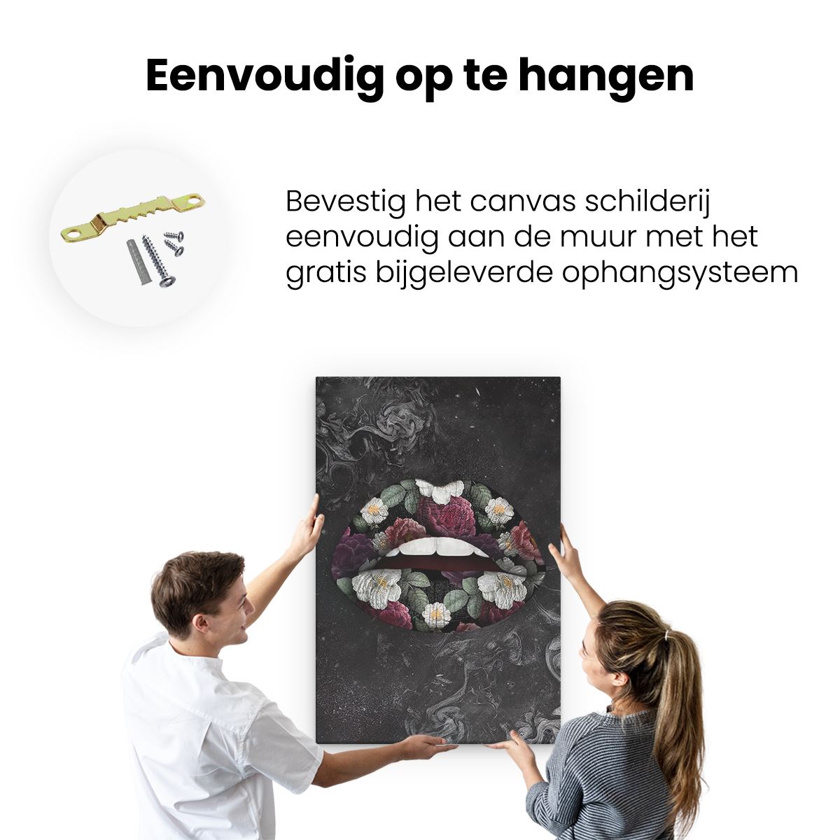 Bij aankoop ontvang je een meegeleverd ophangsysteem, zodat je op een simpele en snelle wijze het schilderij boven de bank of bed kan monteren.
