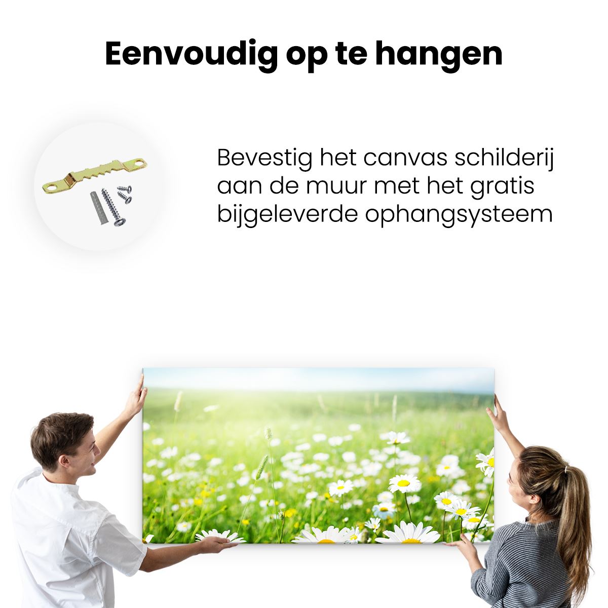 Bij aankoop ontvang je een meegeleverd ophangsysteem, zodat je op een simpele en snelle wijze het schilderij boven de bank of bed kan monteren.