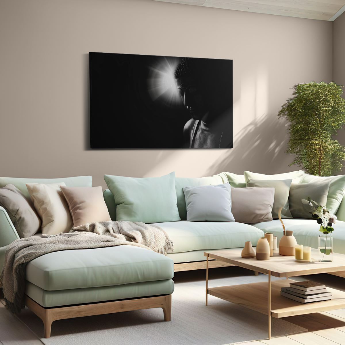 Schilderij Boeddha Beeld met Gouden Zon - Zwart Wit