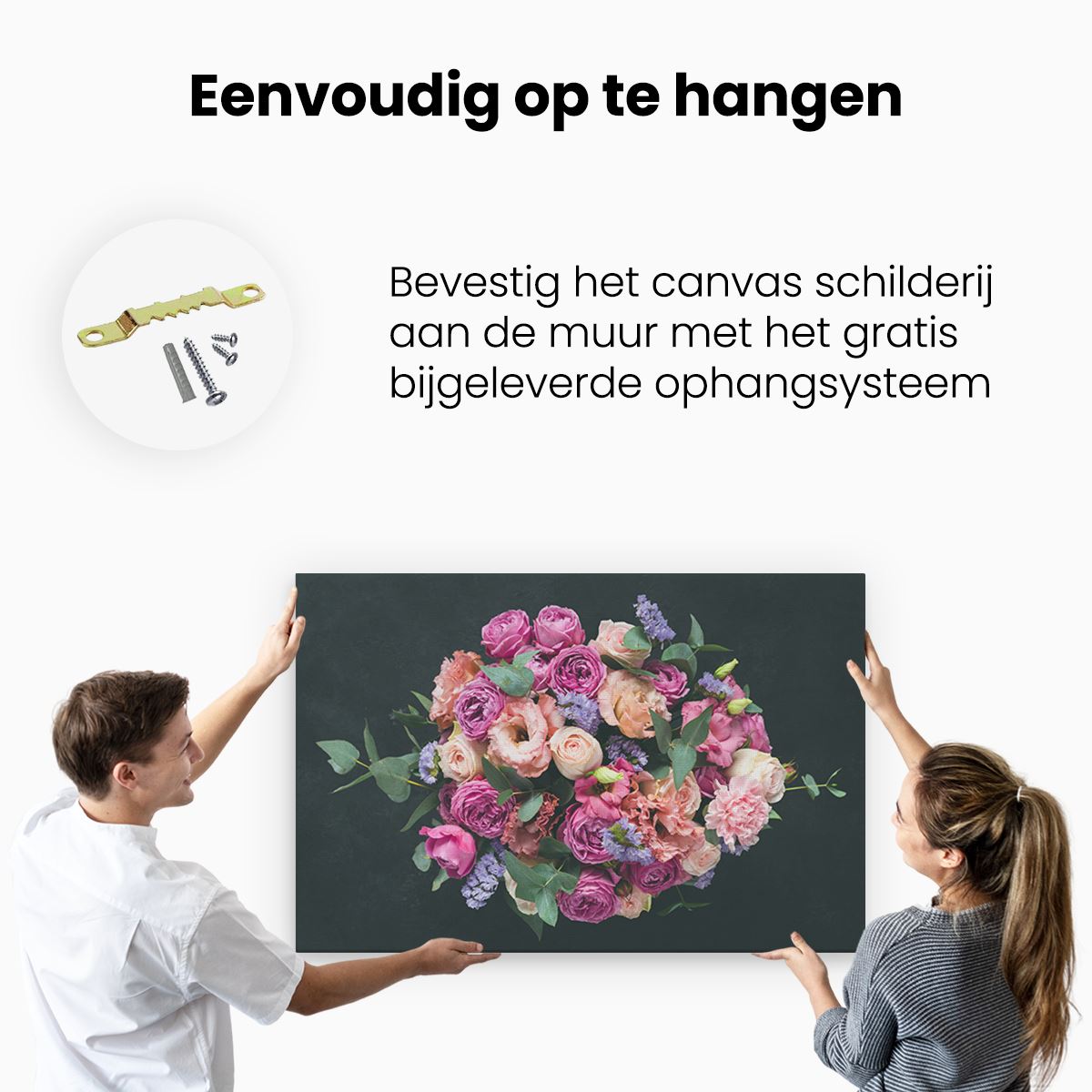 Bij aankoop ontvang je een meegeleverd ophangsysteem, zodat je op een simpele en snelle wijze het schilderij boven de bank of bed kan monteren.