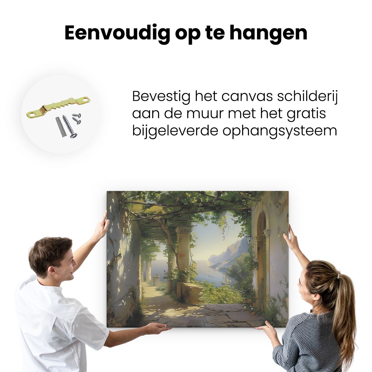 Bij aankoop ontvang je een meegeleverd ophangsysteem, zodat je op een simpele en snelle wijze het schilderij boven de bank of bed kan monteren.