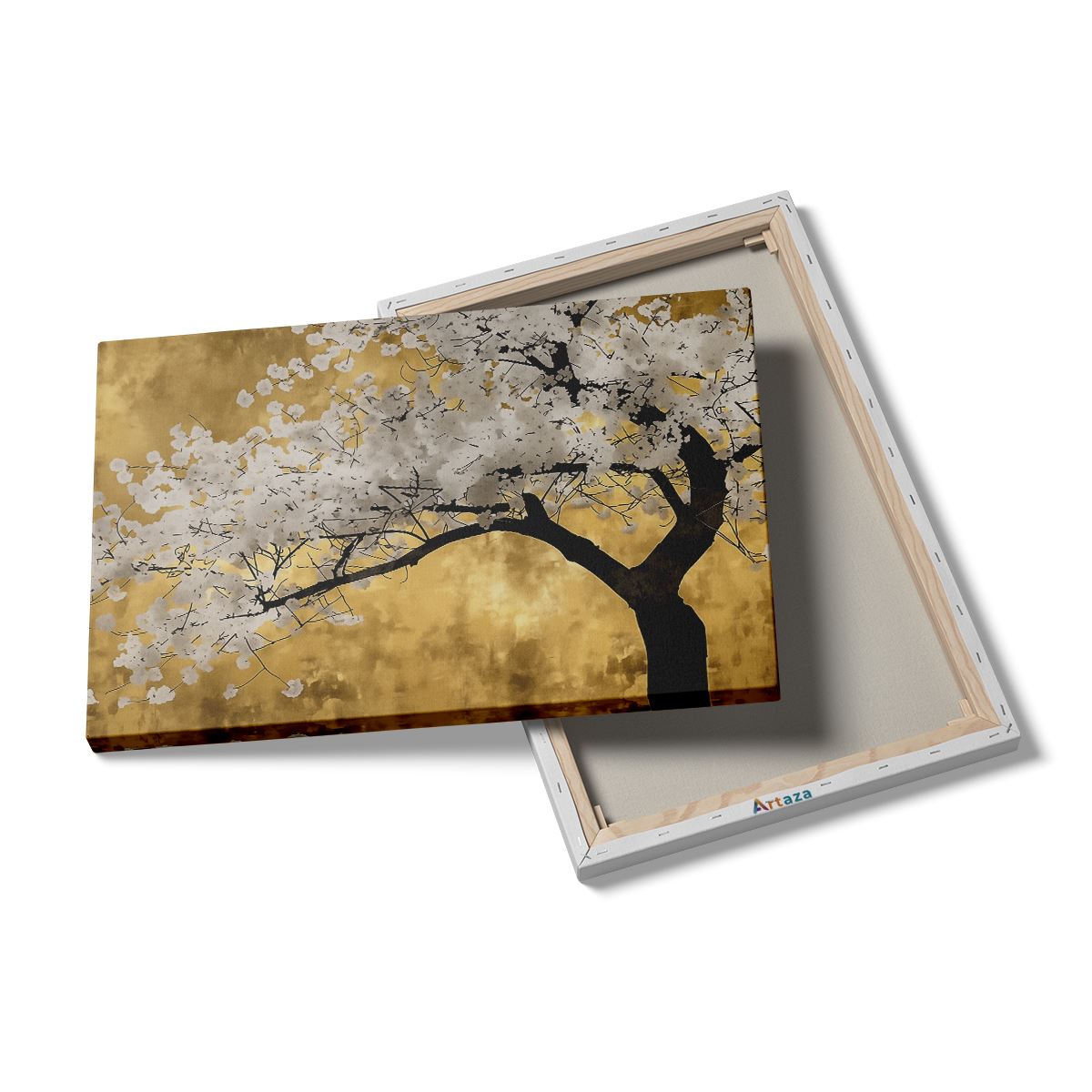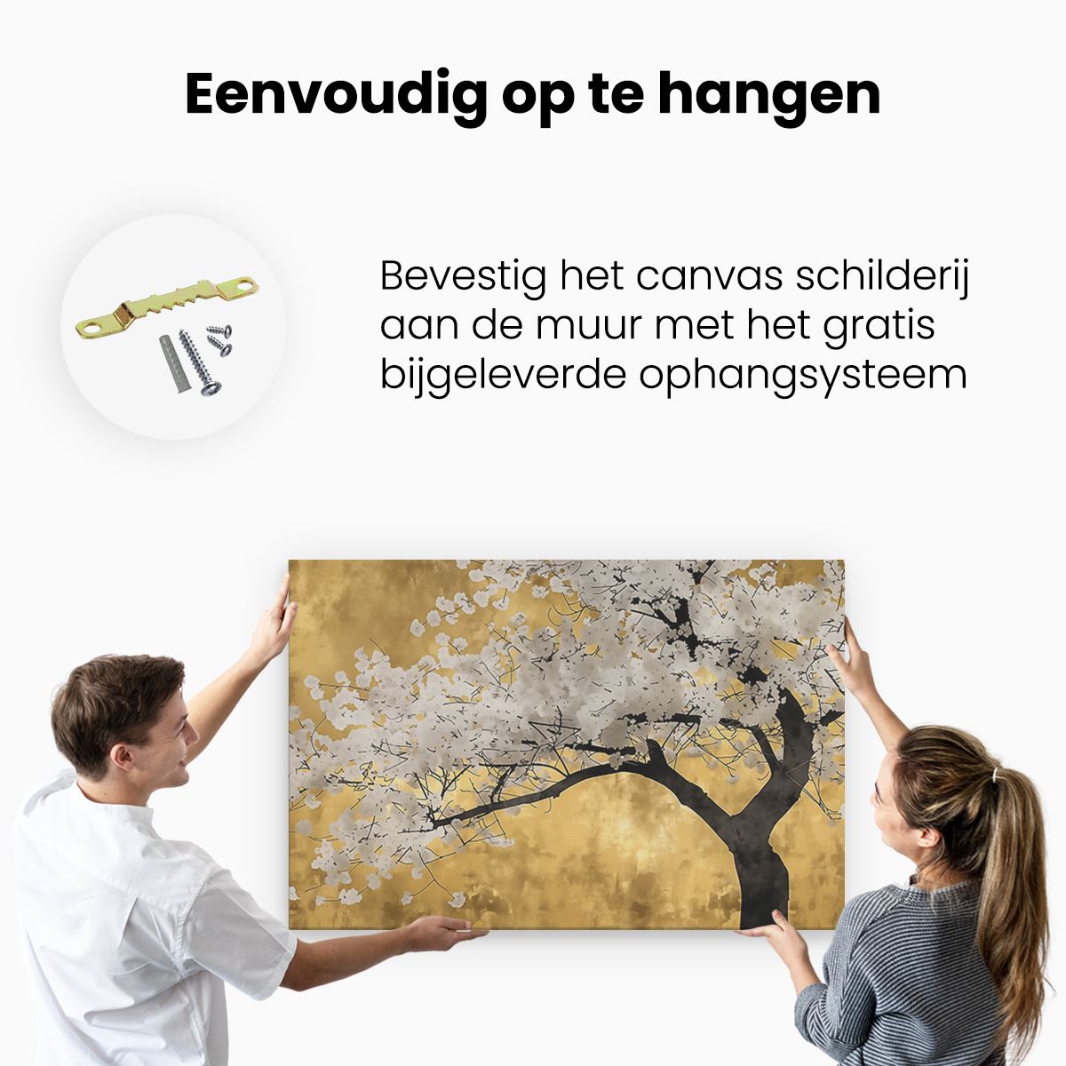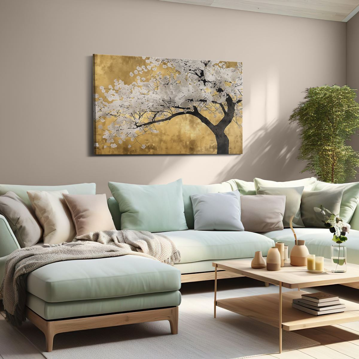 Schilderij Boom met Witte Bloemen tegen een Gouden Achtergrond