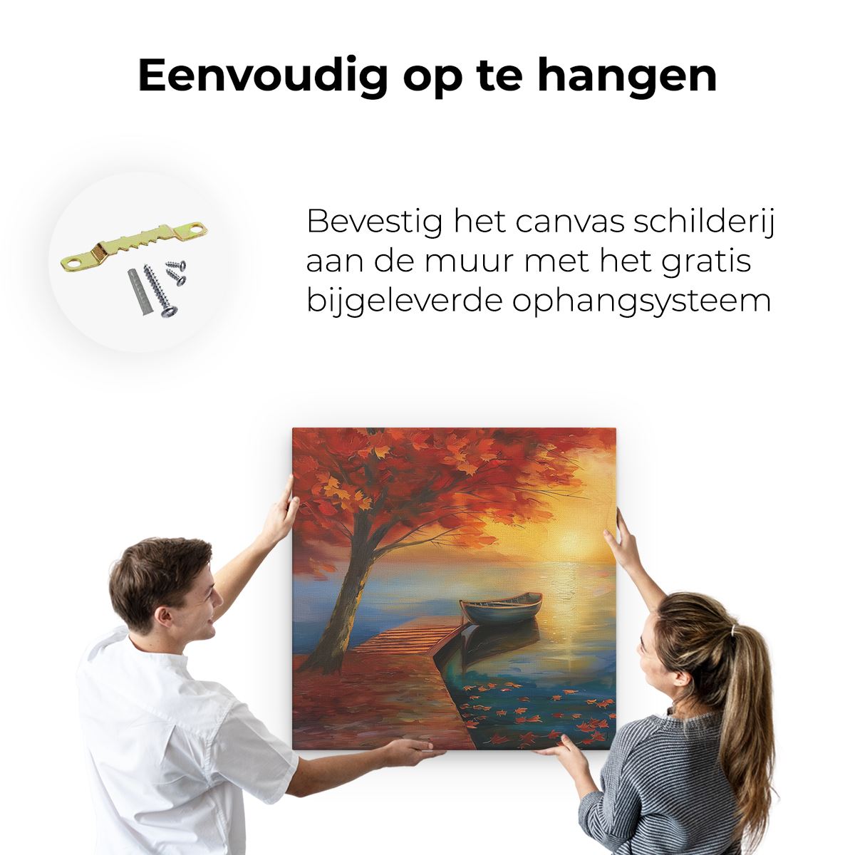 Bij aankoop ontvang je een meegeleverd ophangsysteem, zodat je op een simpele en snelle wijze het schilderij boven de bank of bed kan monteren.
