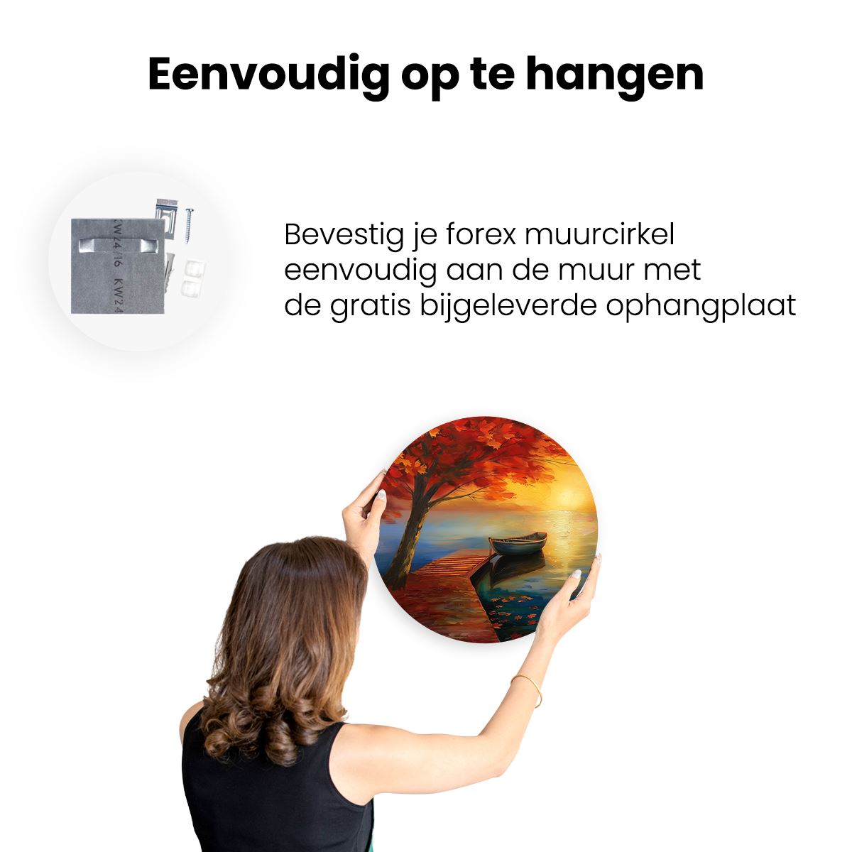 Gebruik het meegeleverde bevestigingsmateriaal om de wandcirkel aan de meeste wanden om te kunnen hangen. Een schroef en plug leveren we mee.