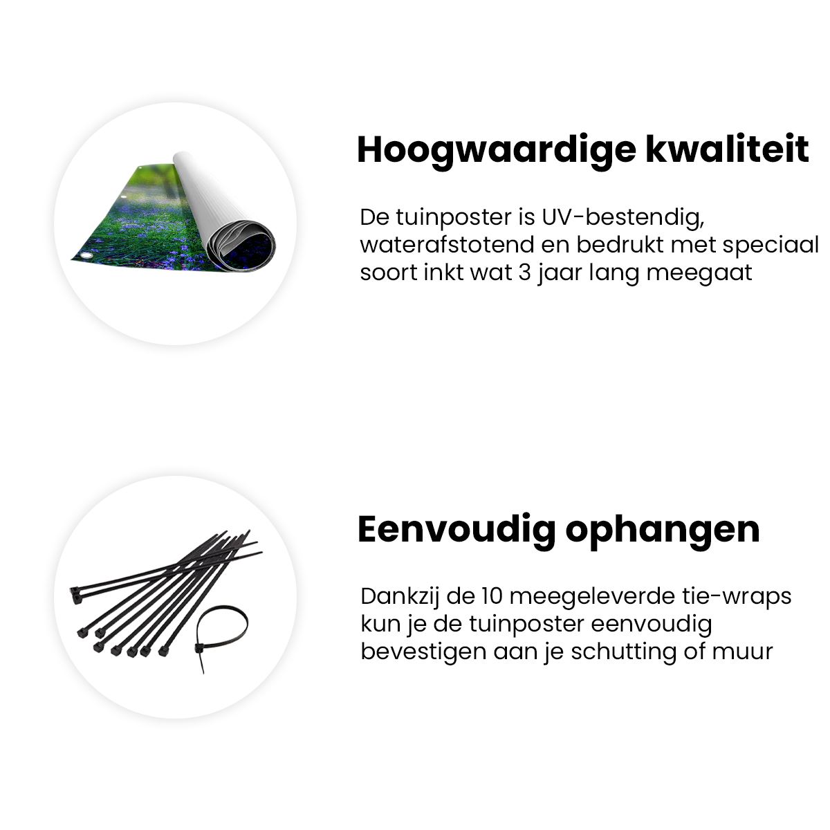 Bij aankoop ontvang je een meegeleverd ophangsysteem, zodat je op een simpele en snelle wijze de tuinposter kan ophangen.