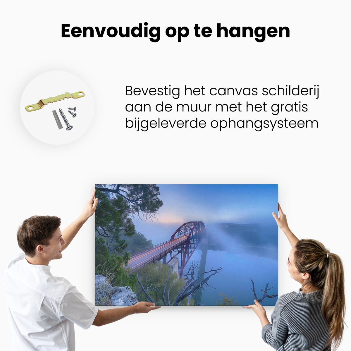 Bij aankoop ontvang je een meegeleverd ophangsysteem, zodat je op een simpele en snelle wijze het schilderij boven de bank of bed kan monteren.