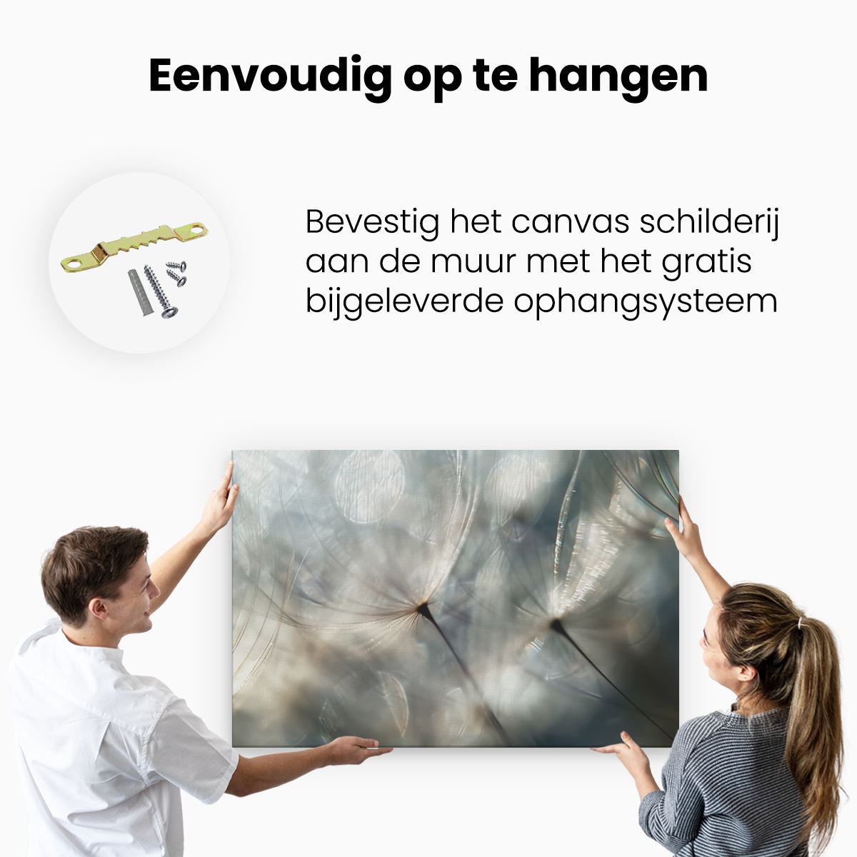 Bij aankoop ontvang je een meegeleverd ophangsysteem, zodat je op een simpele en snelle wijze het schilderij boven de bank of bed kan monteren.