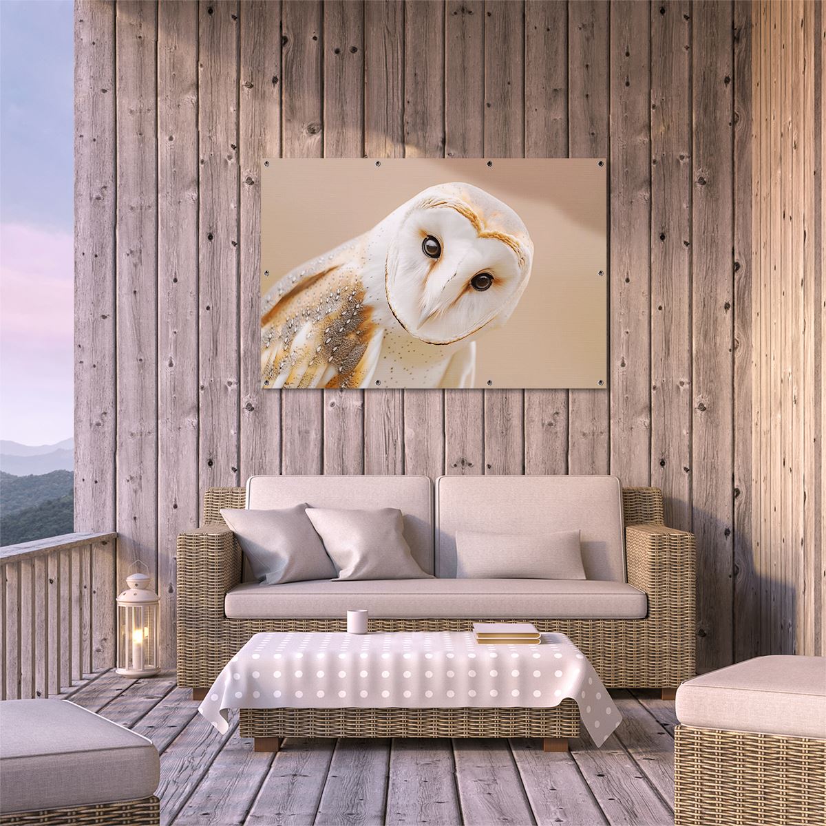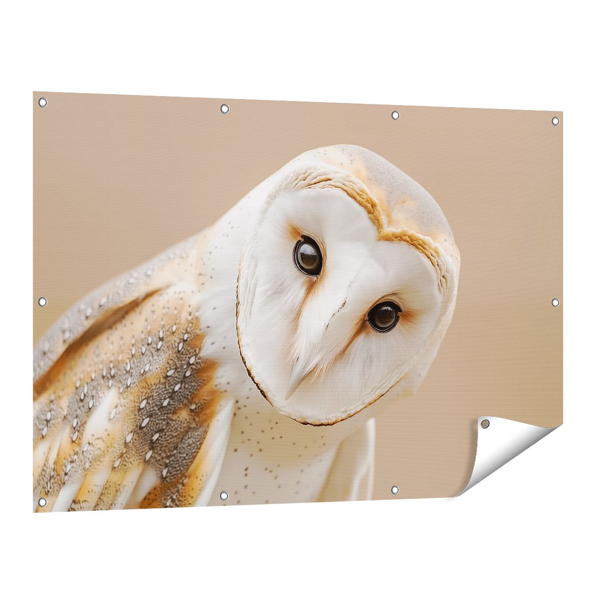 Tuinposter Close Up van een Uil op een Beige Achtergrond