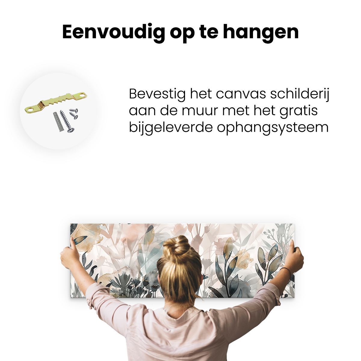 Bij aankoop ontvang je een meegeleverd ophangsysteem, zodat je op een simpele en snelle wijze het schilderij boven de bank of bed kan monteren.