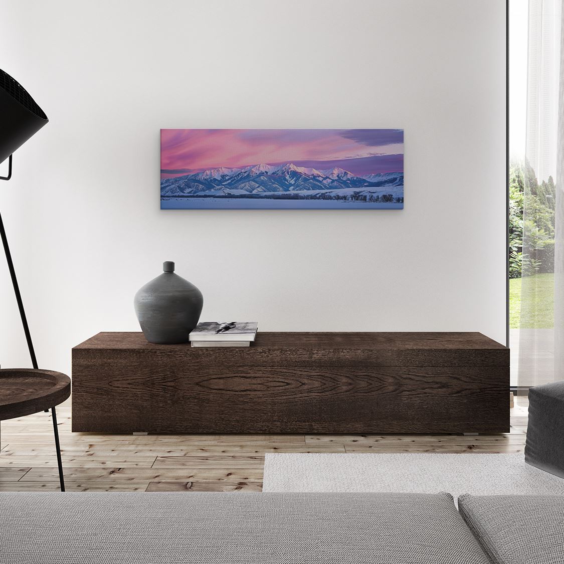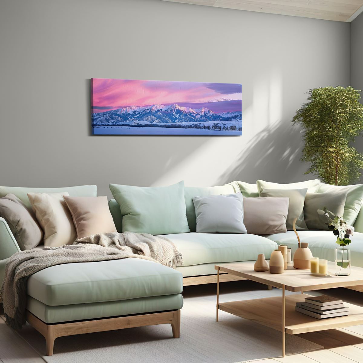 Schilderij De Bergen Zijn Bedekt met Sneeuw en de Lucht is Roze