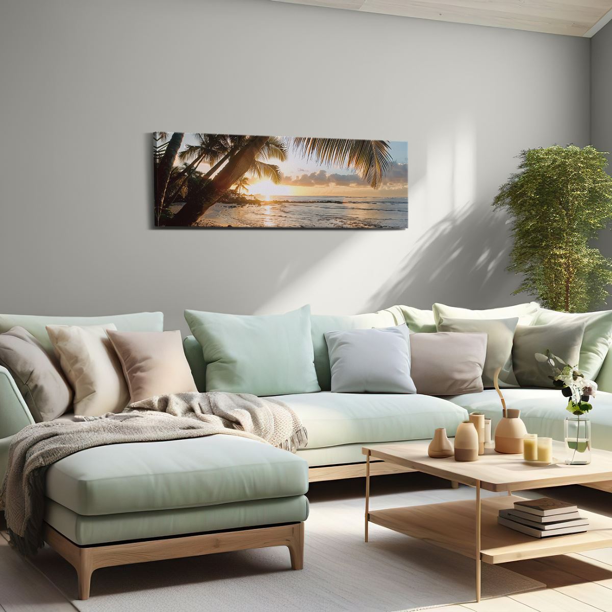 Schilderij De Zon gaat onder over een Strand met Palmbomen