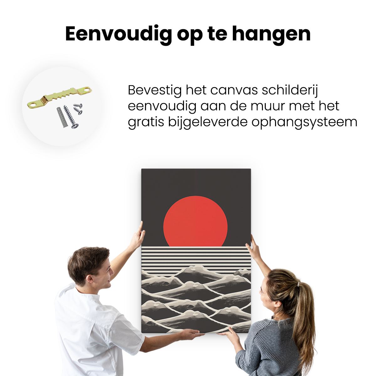 Bij aankoop ontvang je een meegeleverd ophangsysteem, zodat je op een simpele en snelle wijze het schilderij boven de bank of bed kan monteren.