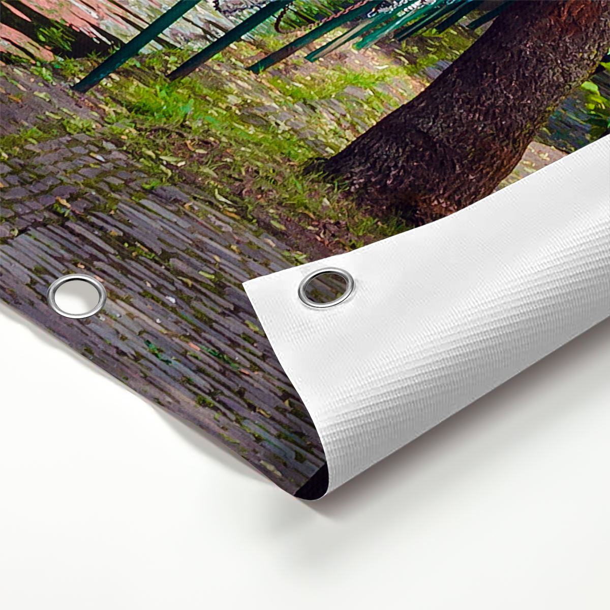 Door de ringen moet je een tiewrap bevestigen, waarmee je de tuinposter aan schroeven aan bijvoorbeeld de schutting kunt bevestigen.