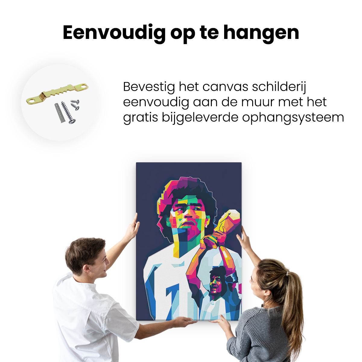 Bij aankoop ontvang je een meegeleverd ophangsysteem, zodat je op een simpele en snelle wijze het schilderij boven de bank of bed kan monteren.
