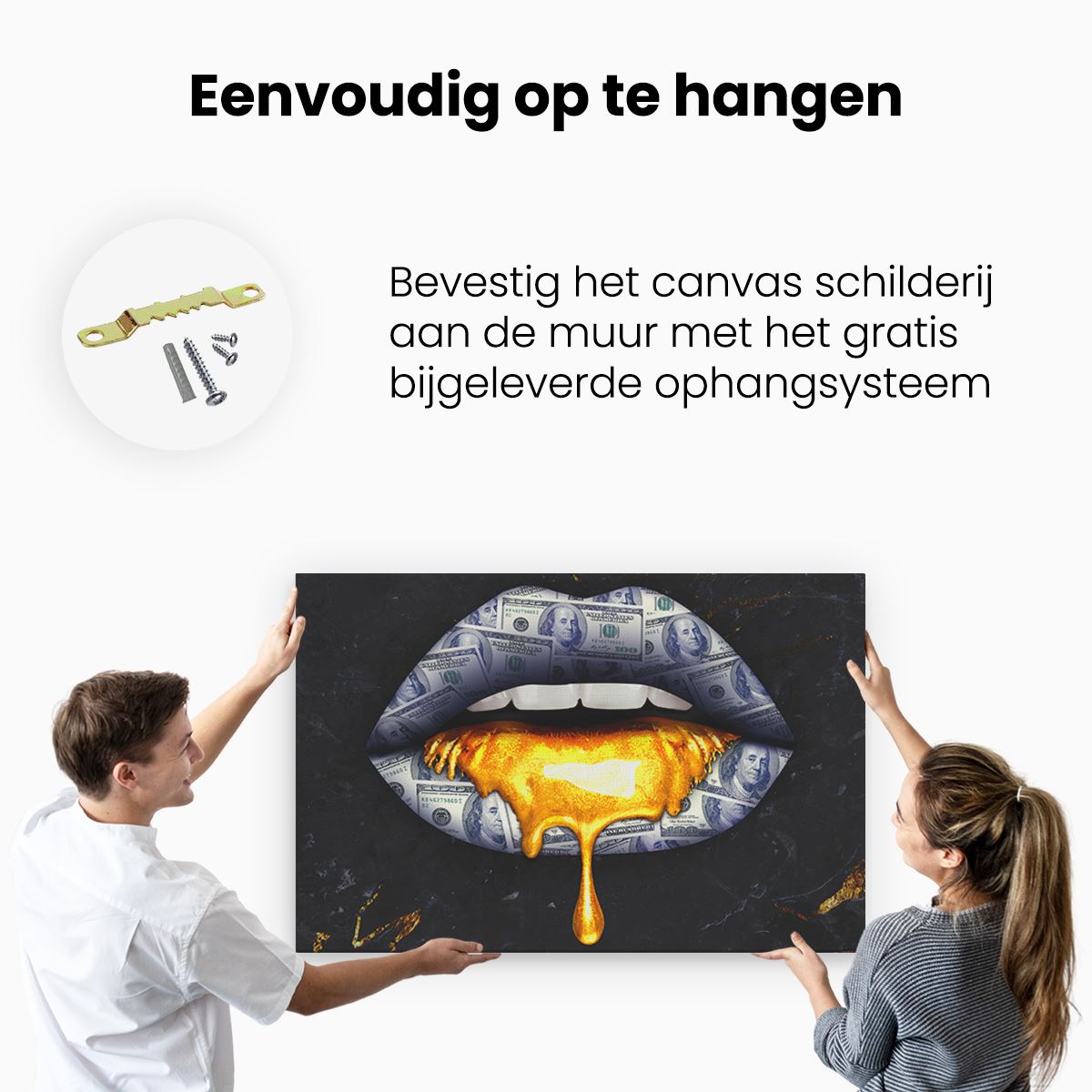 Bij aankoop ontvang je een meegeleverd ophangsysteem, zodat je op een simpele en snelle wijze het schilderij boven de bank of bed kan monteren.
