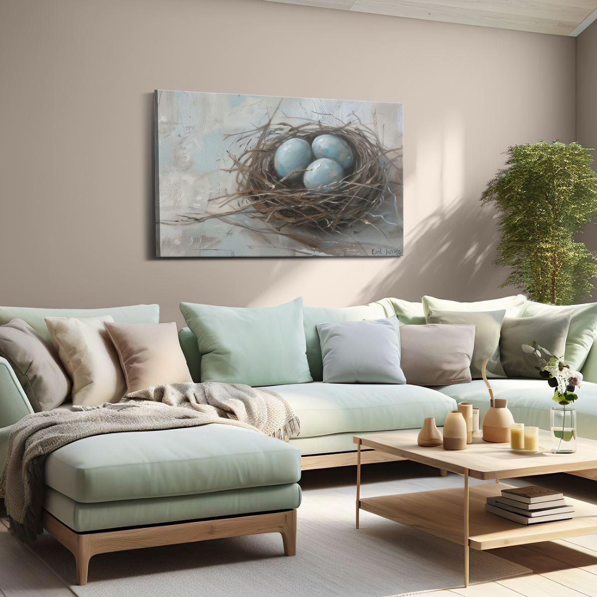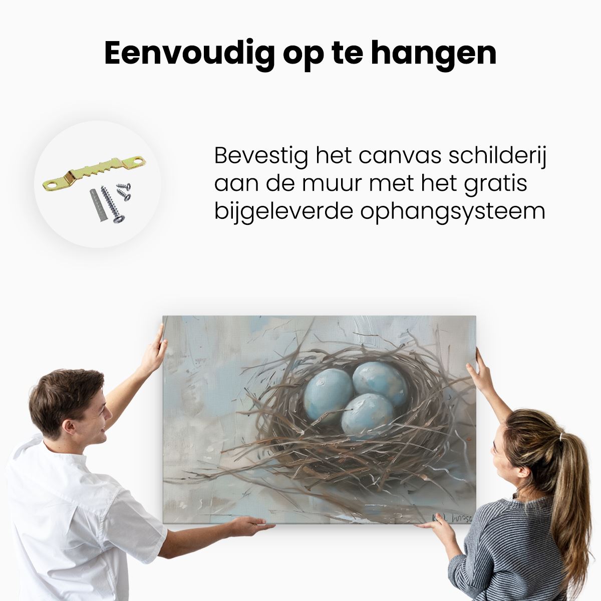 Bij aankoop ontvang je een meegeleverd ophangsysteem, zodat je op een simpele en snelle wijze het schilderij boven de bank of bed kan monteren.