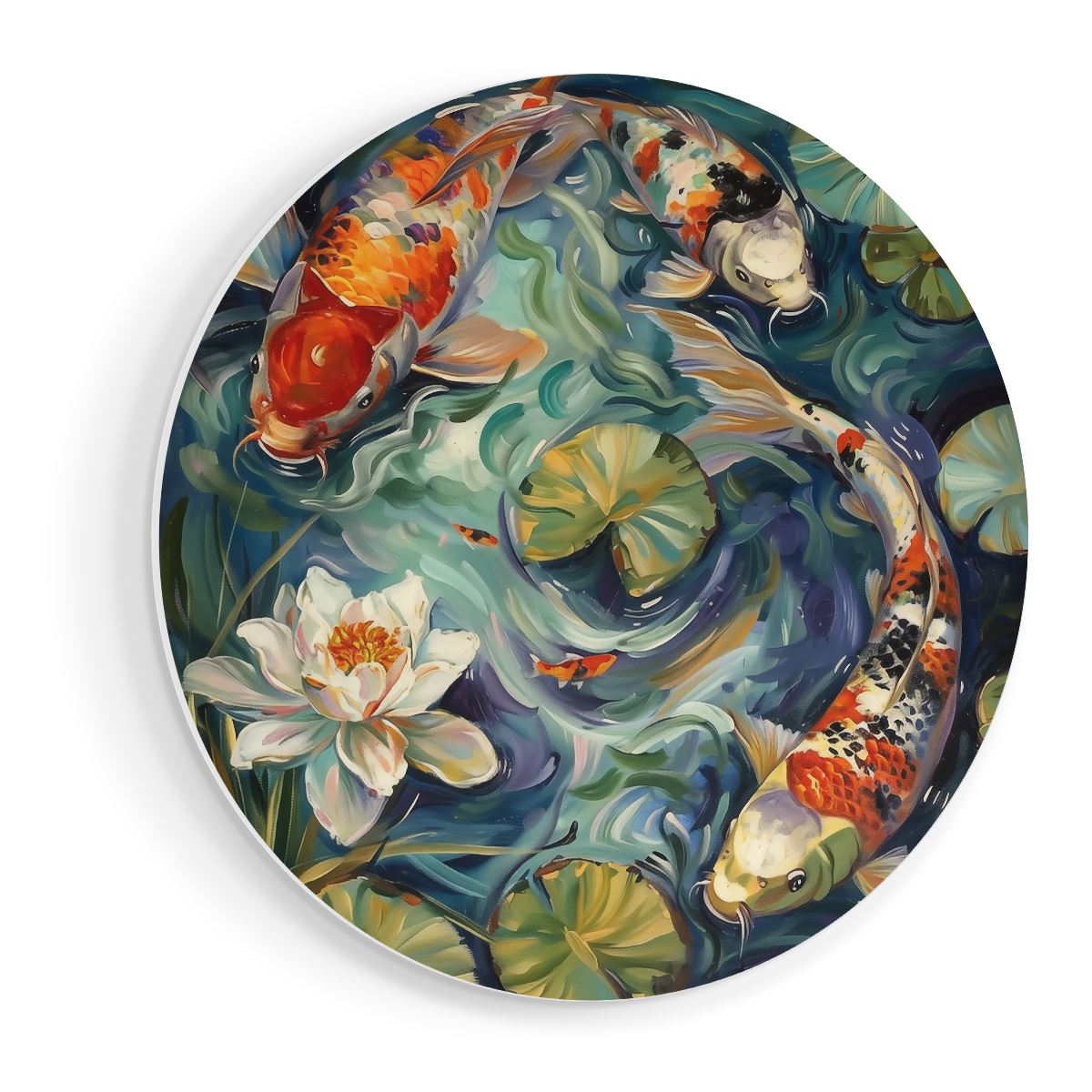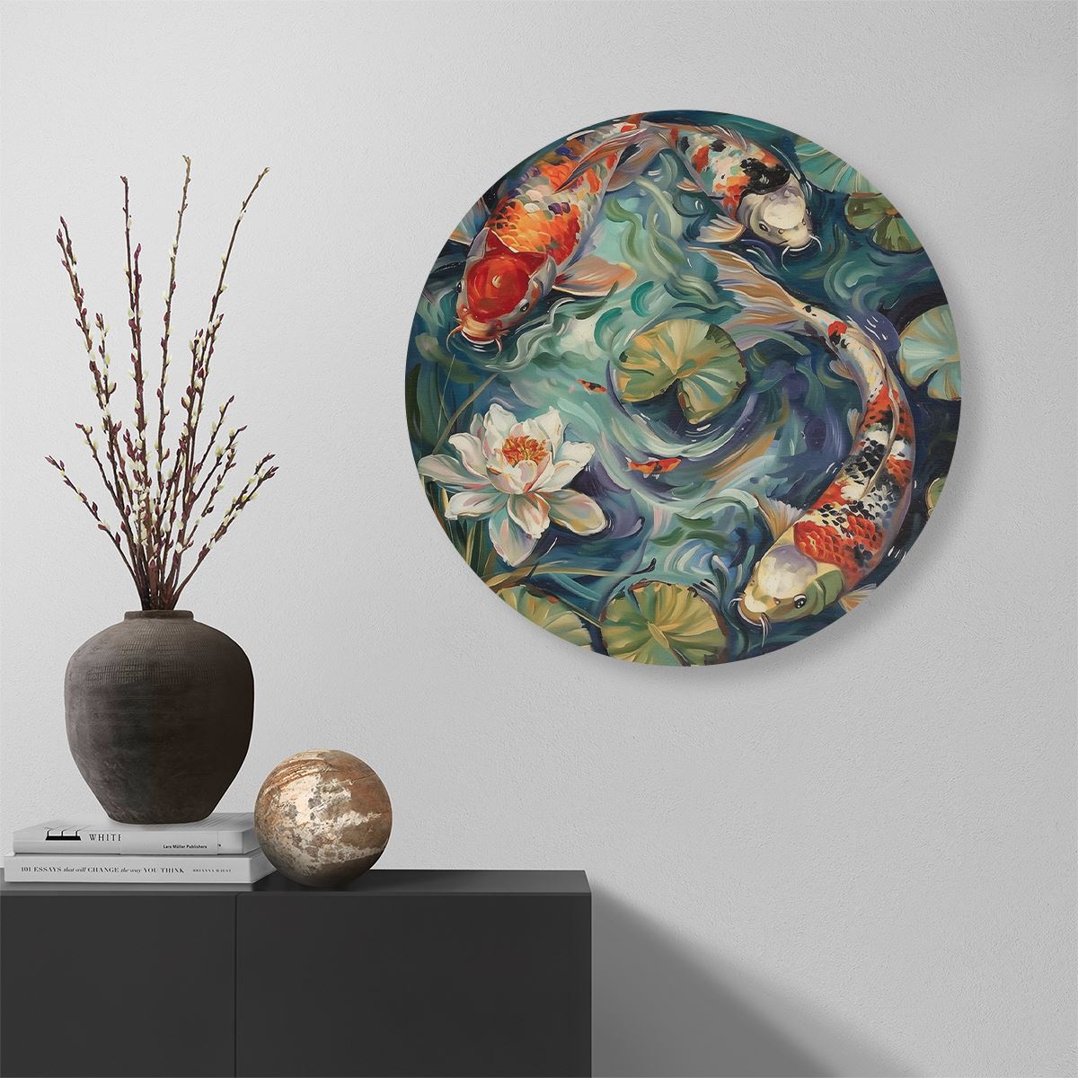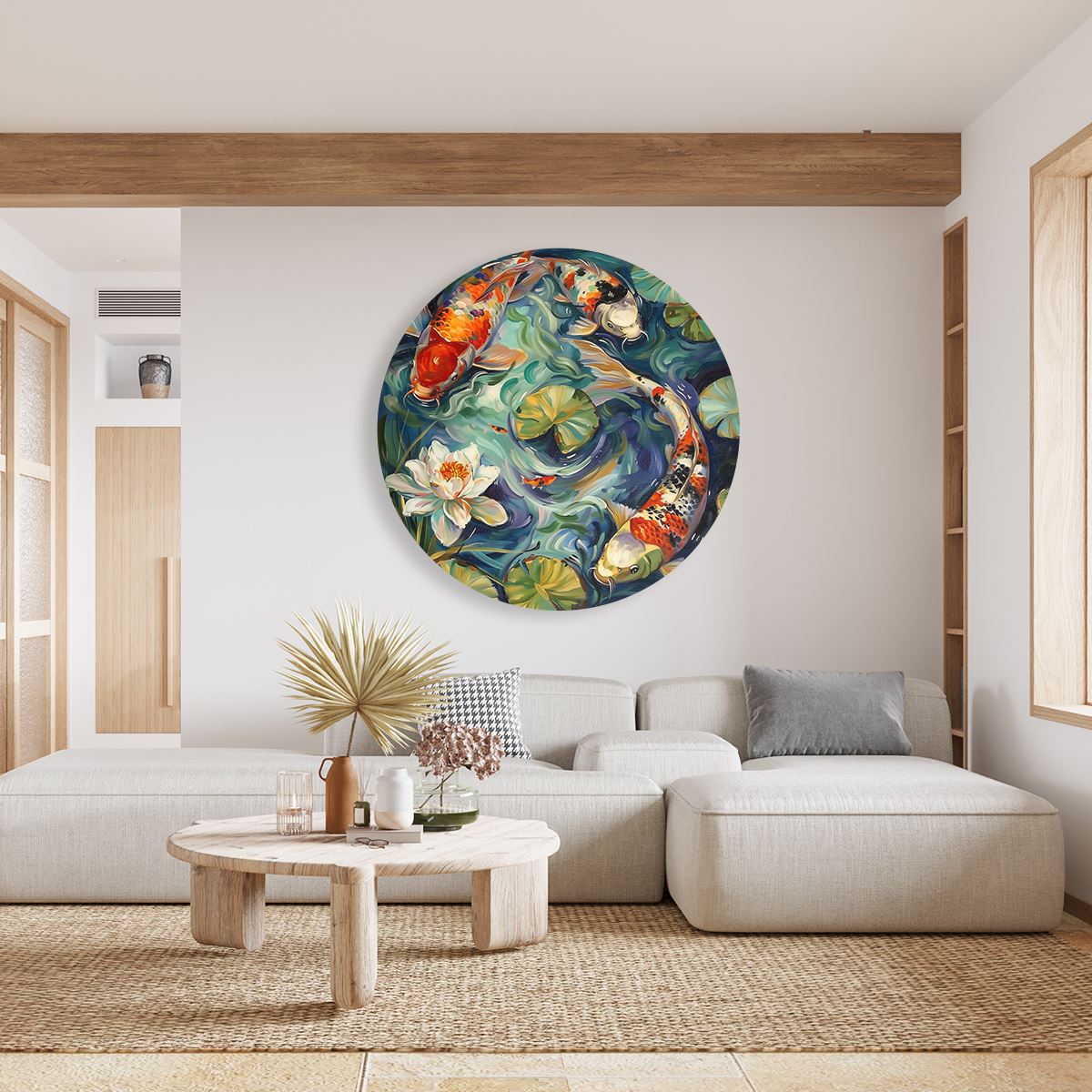 Wandcirkel Drie Koivissen in een Vijver met Waterlelies