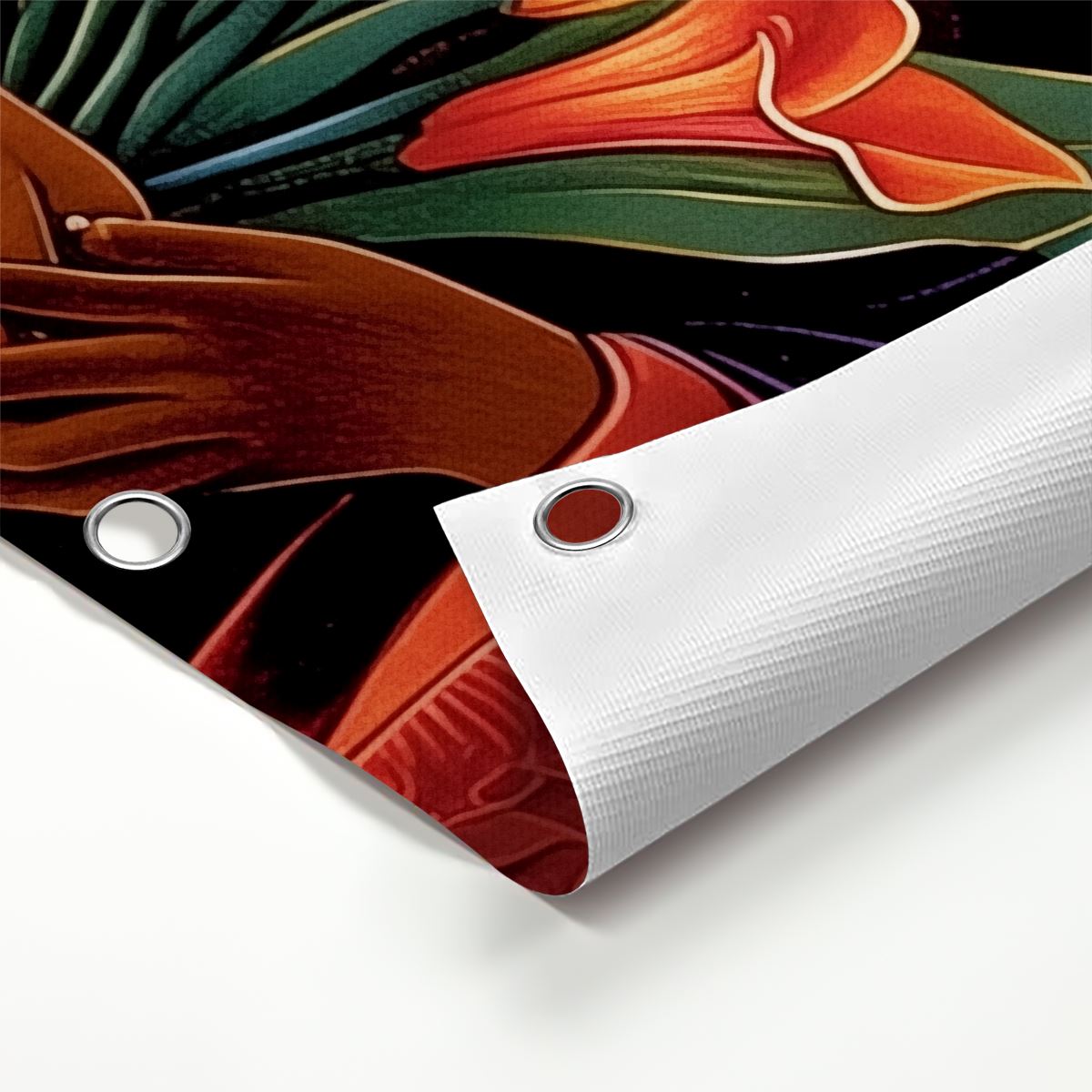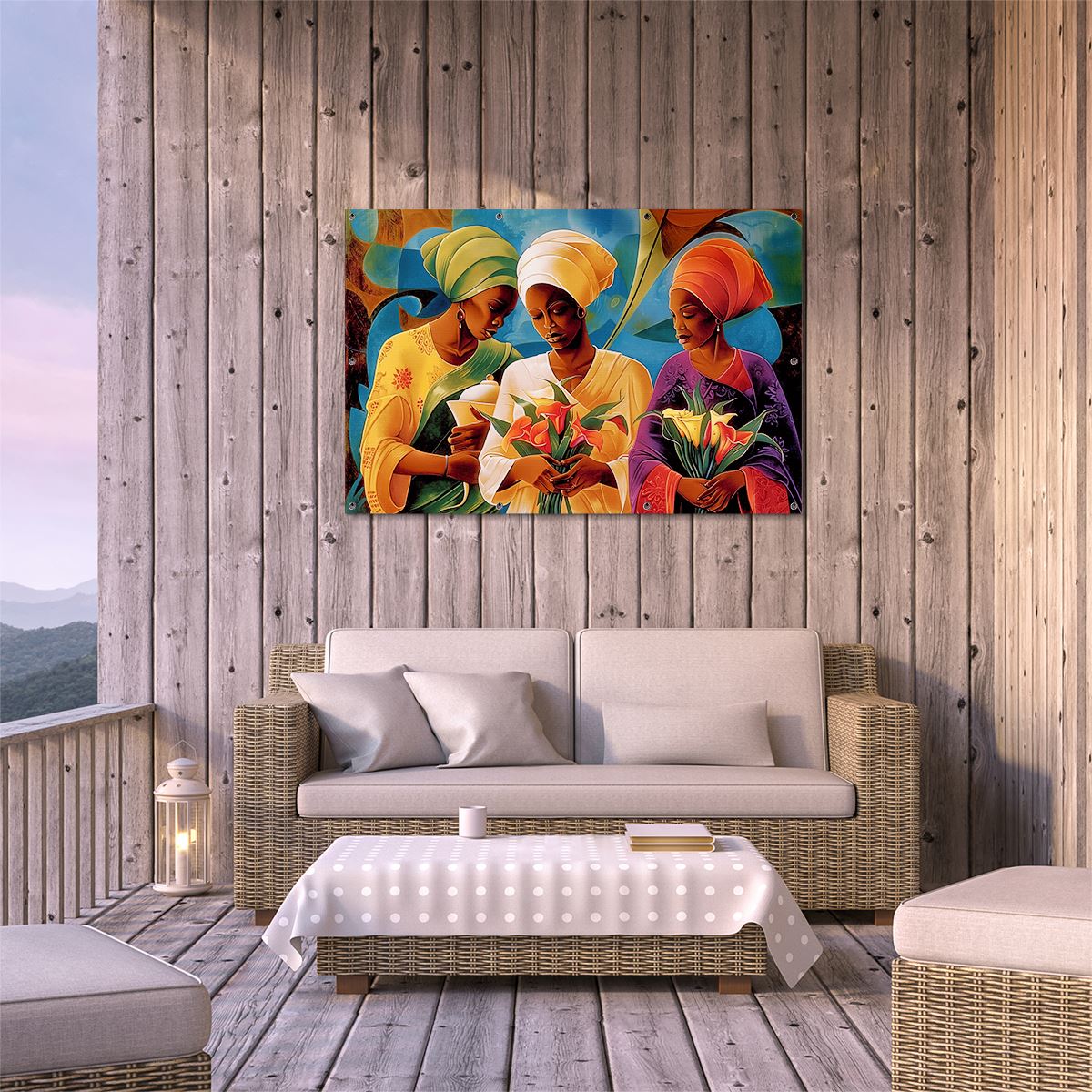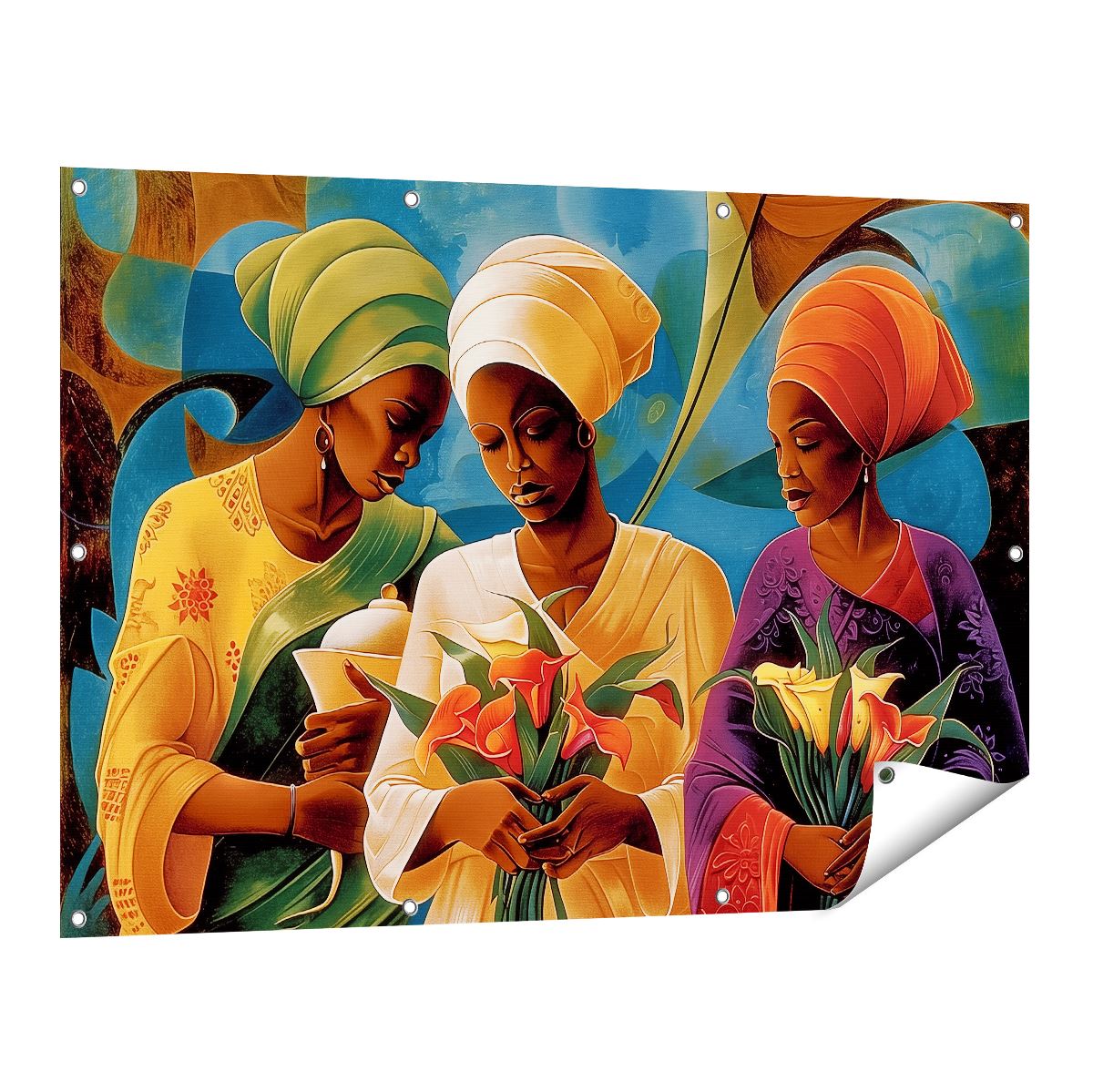 Tuinposter Drie Vrouwen met Tulbanden die Bloemen Vasthouden