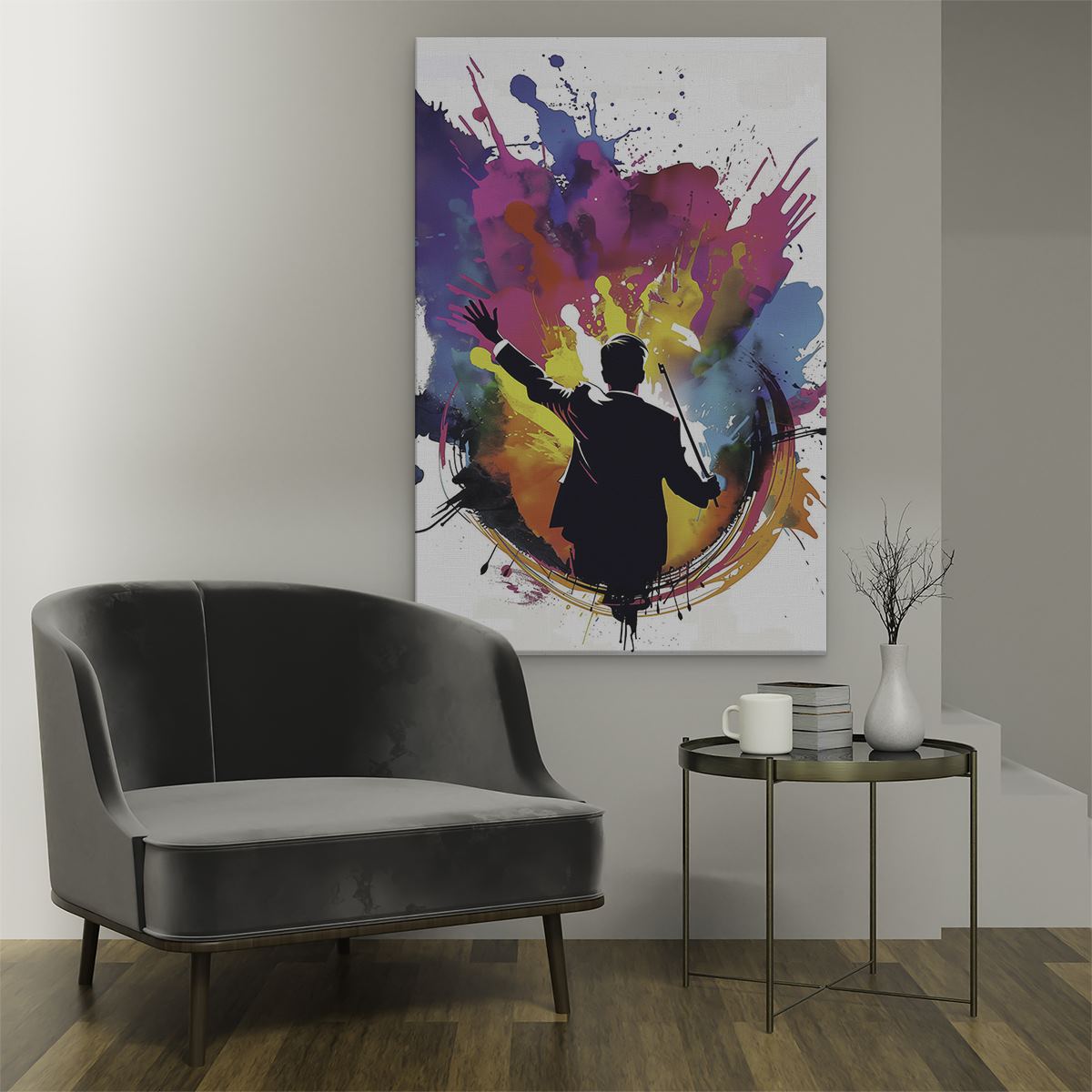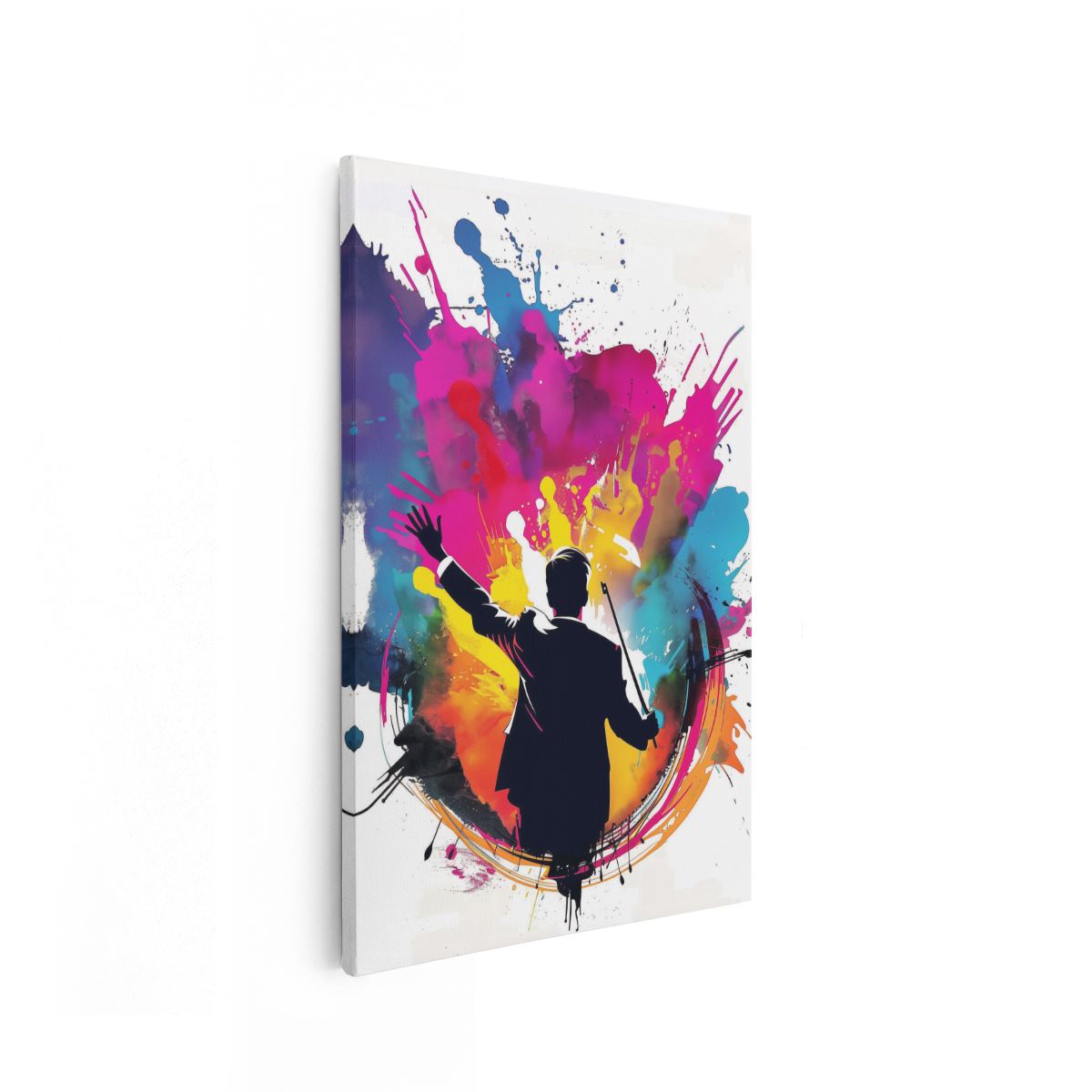 Schilderij Een Man in een Pak Houdt een Stokje Vast voor Kleurrijke Verfspatten