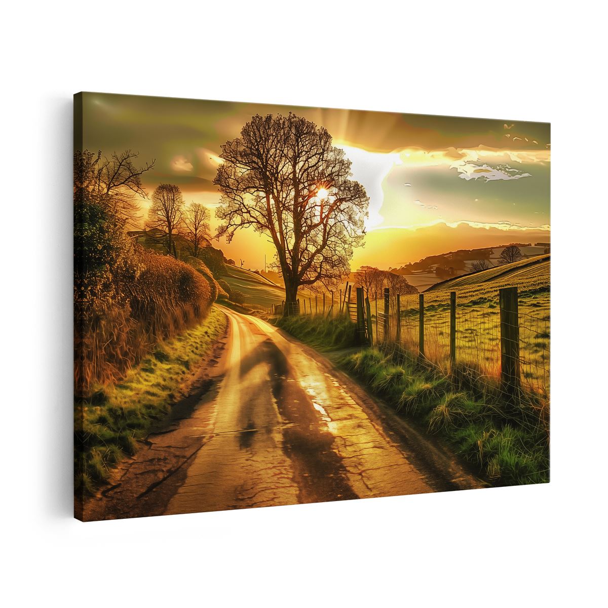 Schilderij Eenzame Boom in een Veld bij Zonsondergang