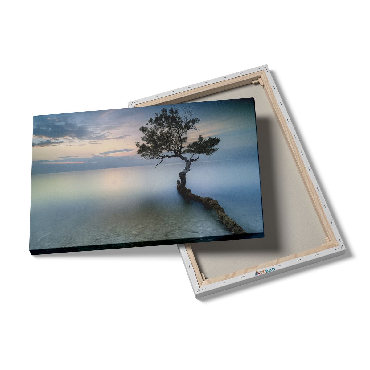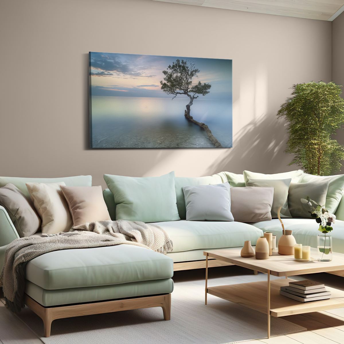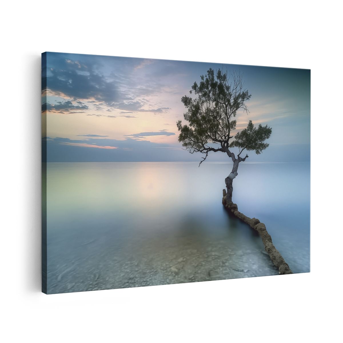 Schilderij Eenzame Boom op een Strand bij Zonsondergang