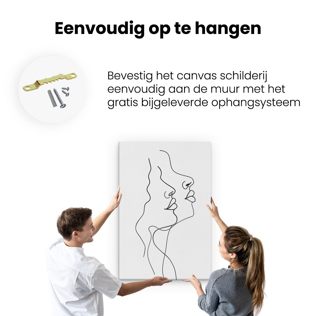Bij aankoop ontvang je een meegeleverd ophangsysteem, zodat je op een simpele en snelle wijze het schilderij boven de bank of bed kan monteren.