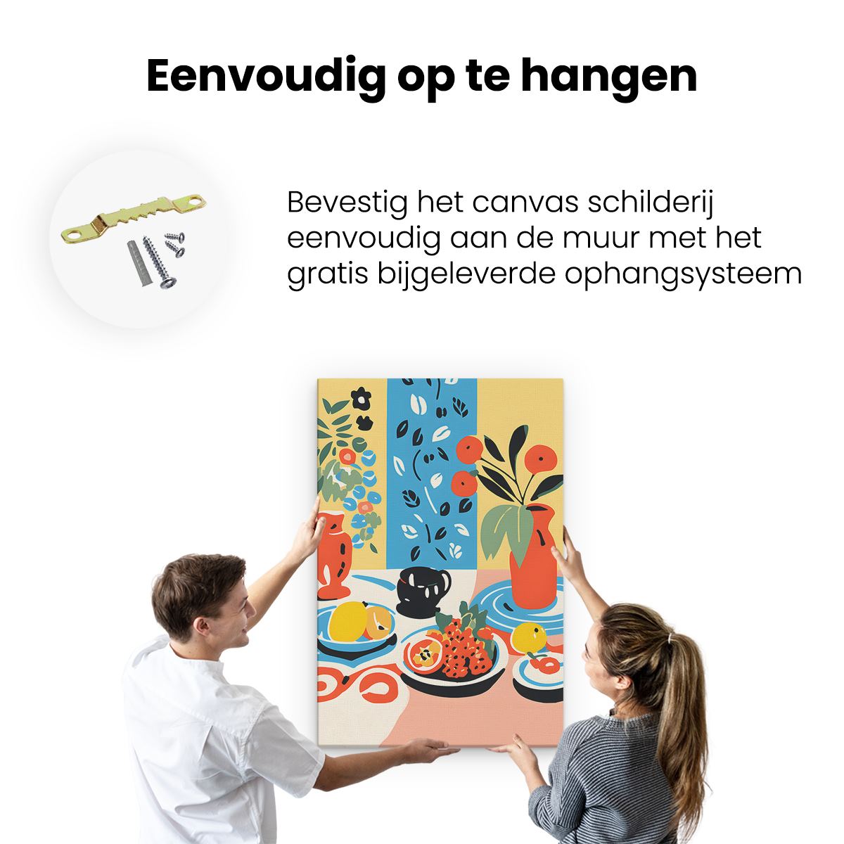Bij aankoop ontvang je een meegeleverd ophangsysteem, zodat je op een simpele en snelle wijze het schilderij boven de bank of bed kan monteren.