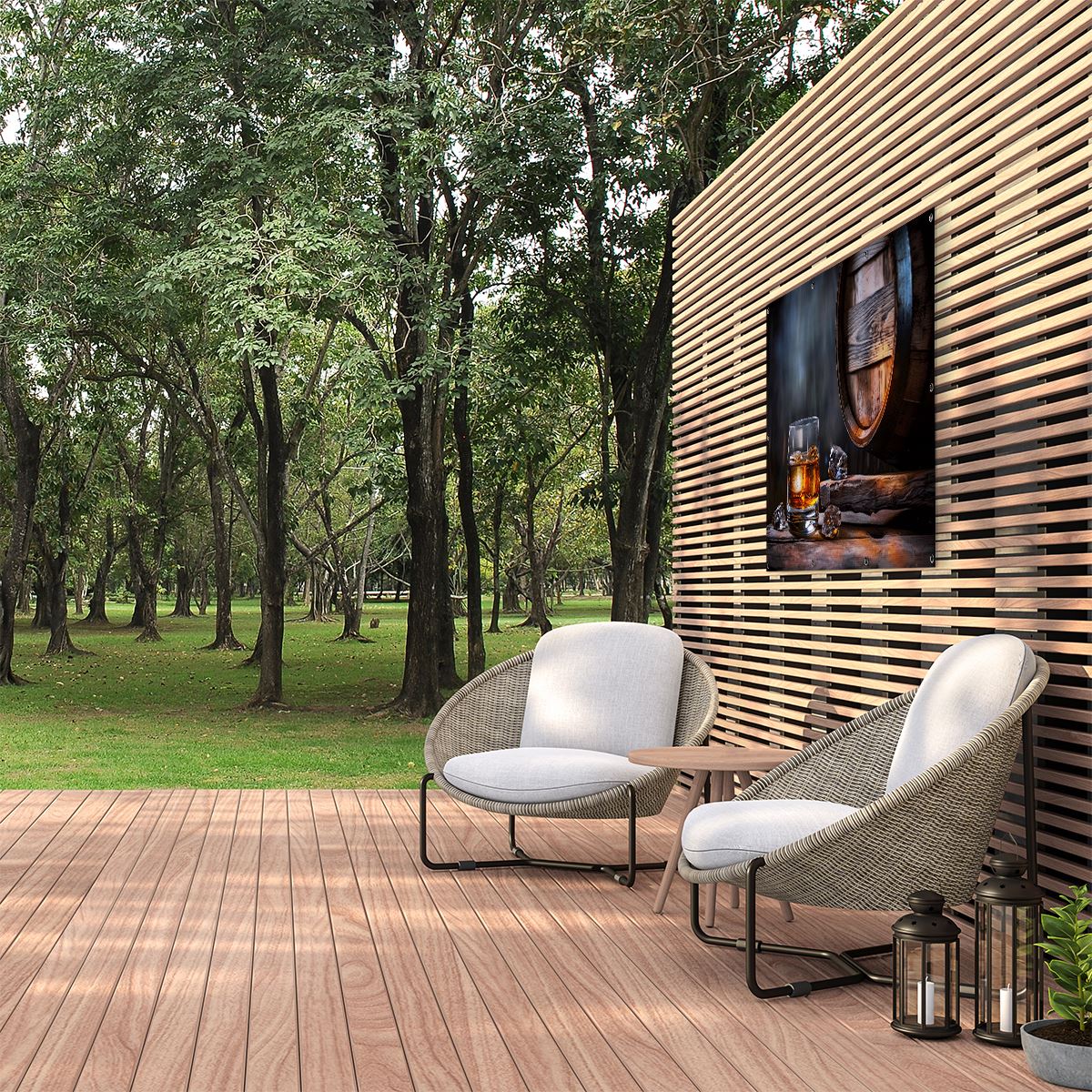 Tuinposter Glas Whisky met IJsblokjes en een Houten Vat