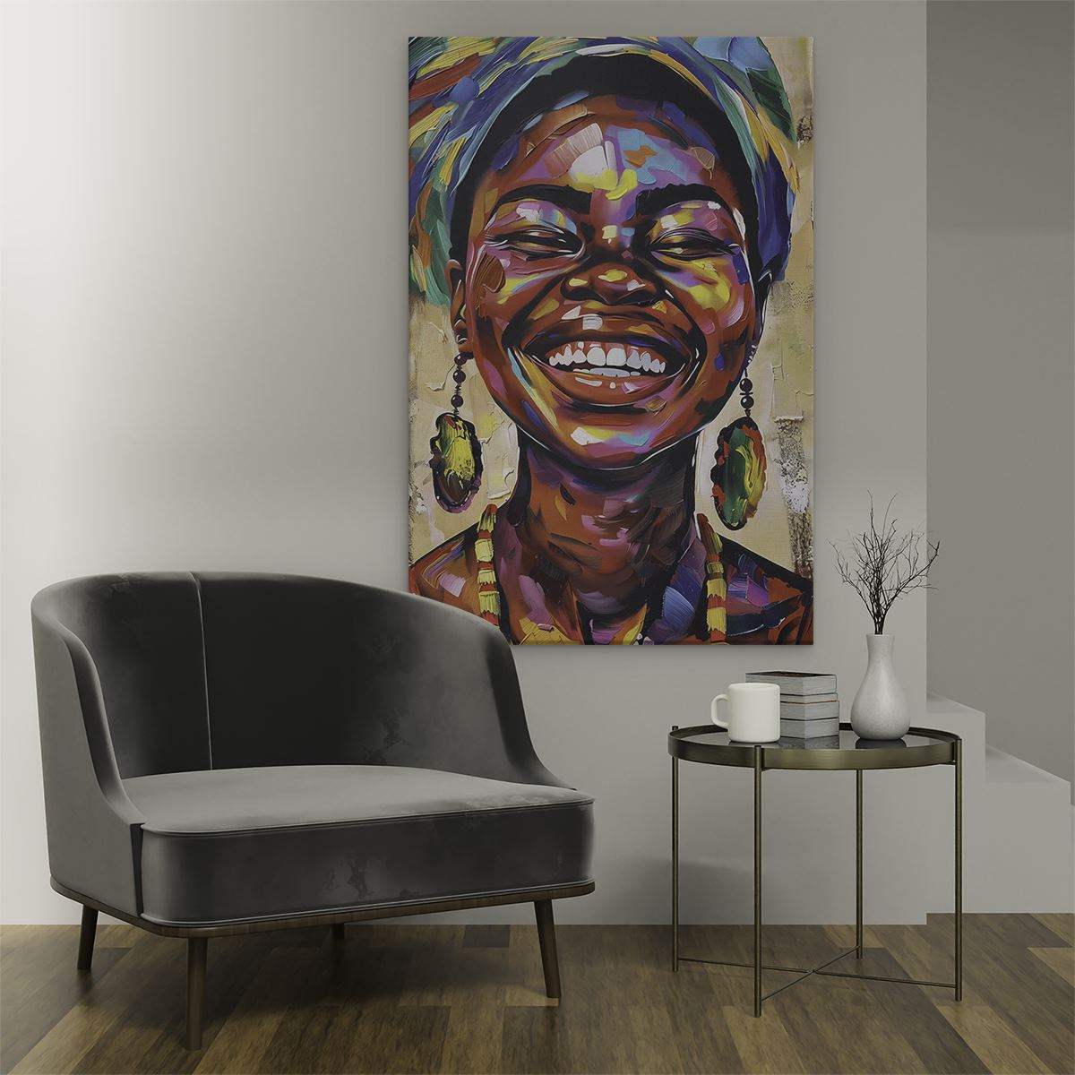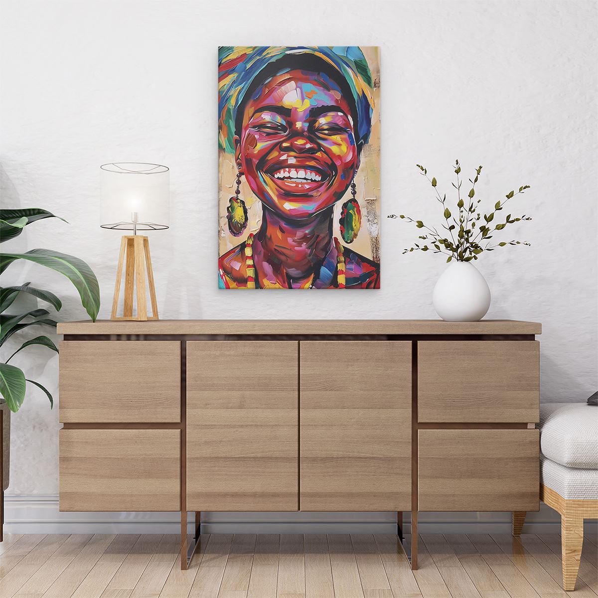 Schilderij Glimlachende Afrikaanse Vrouw die een Kleurrijke Tulband Draagt