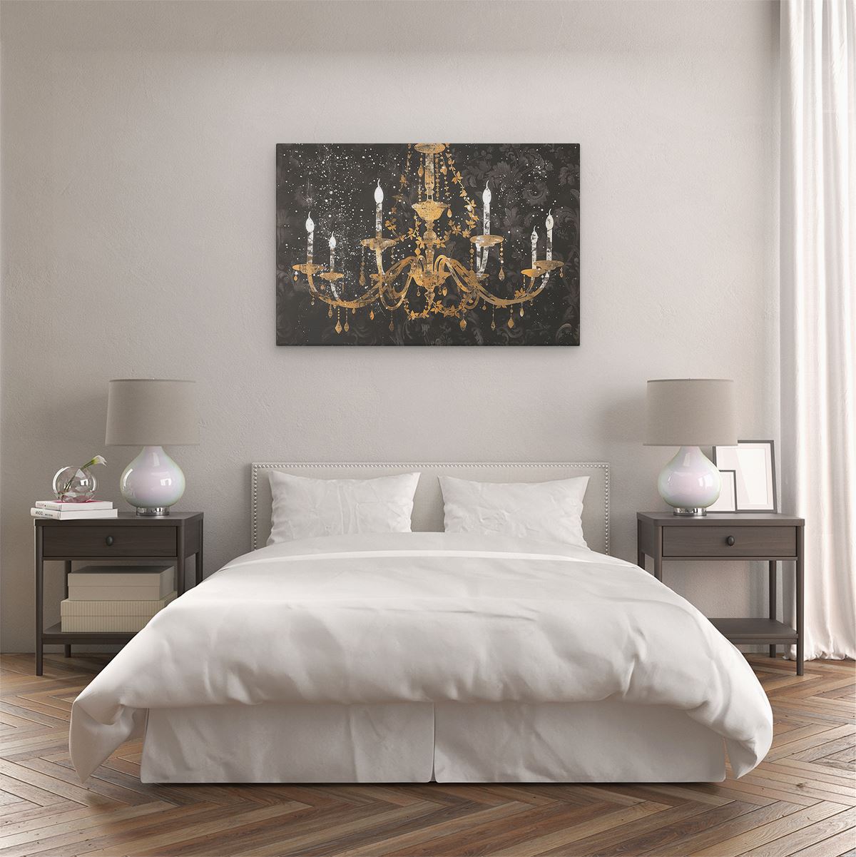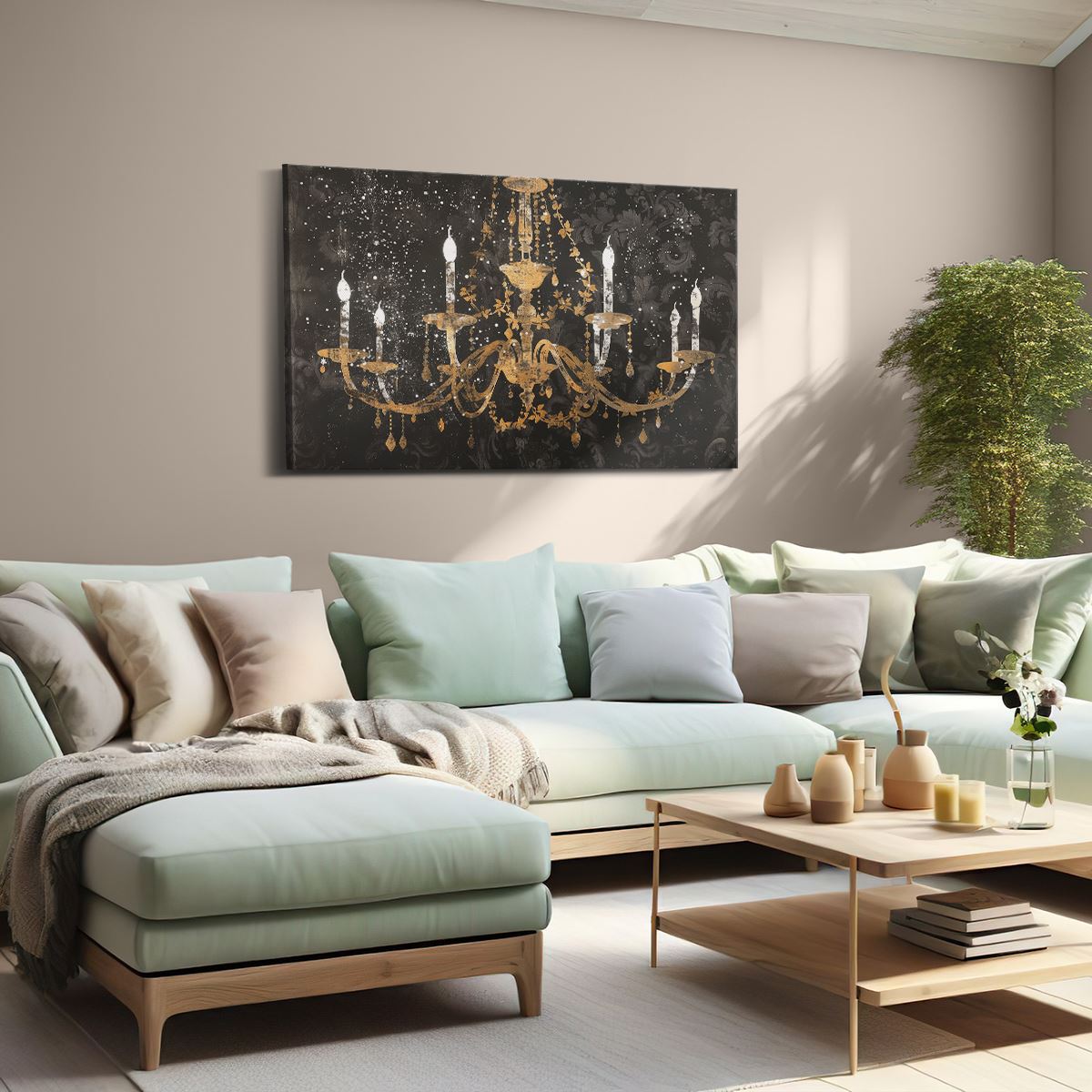 Schilderij Gouden Kroonluchter op een Zwarte Achtergrond