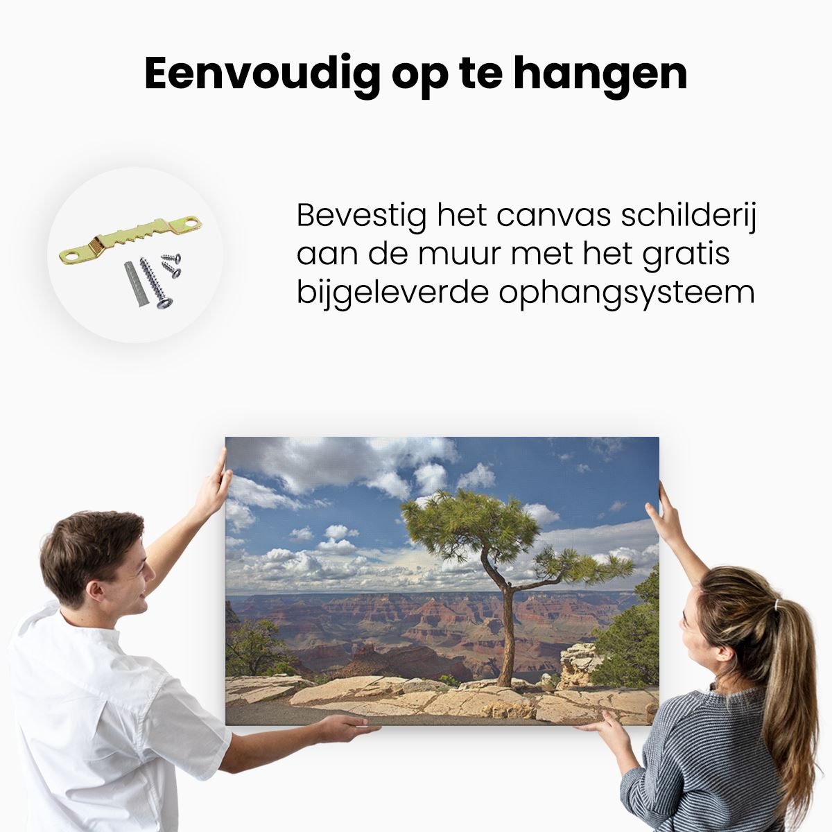 Bij aankoop ontvang je een meegeleverd ophangsysteem, zodat je op een simpele en snelle wijze het schilderij boven de bank of bed kan monteren.