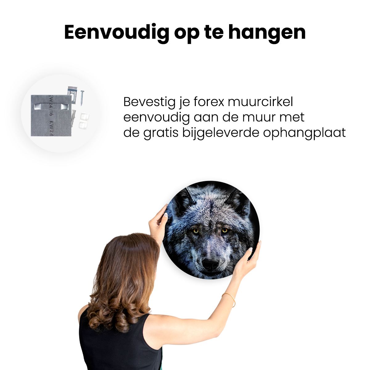Gebruik het meegeleverde bevestigingsmateriaal om de wandcirkel aan de meeste wanden om te kunnen hangen. Een schroef en plug leveren we mee.
