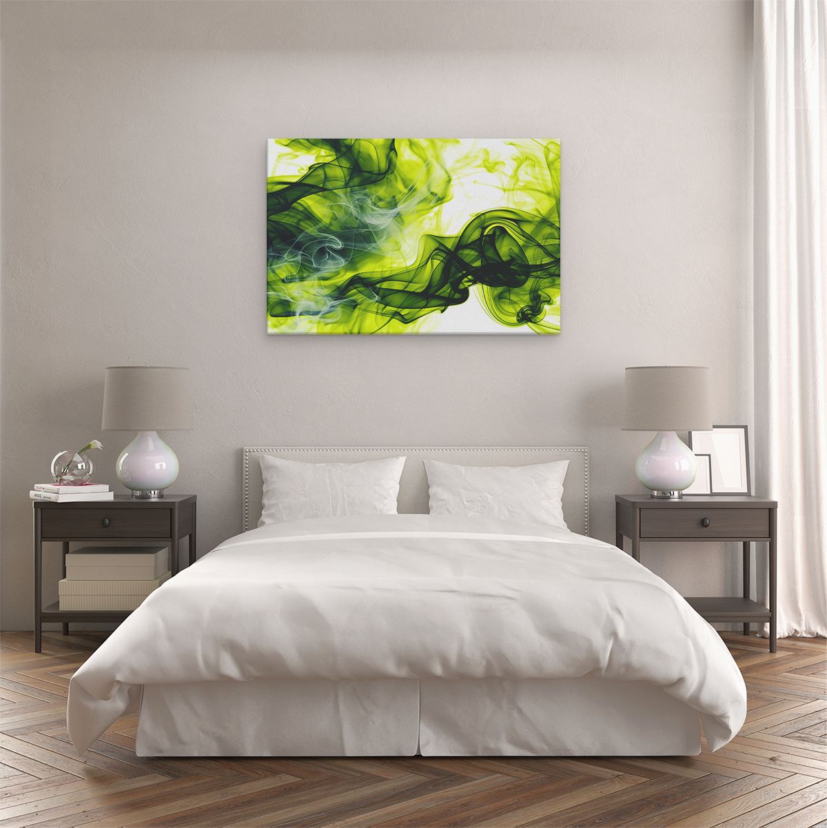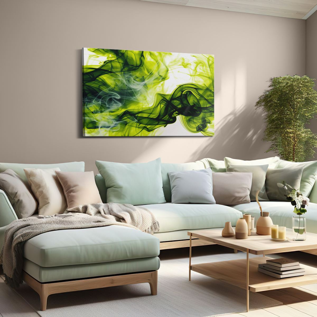 Schilderij Groene en Zwarte Rook op een Witte Achtergrond