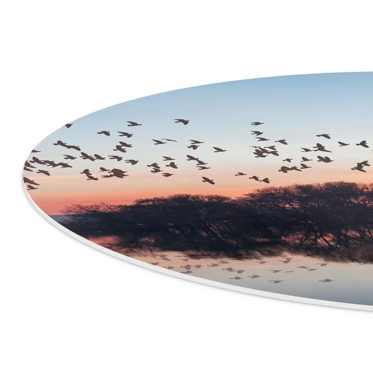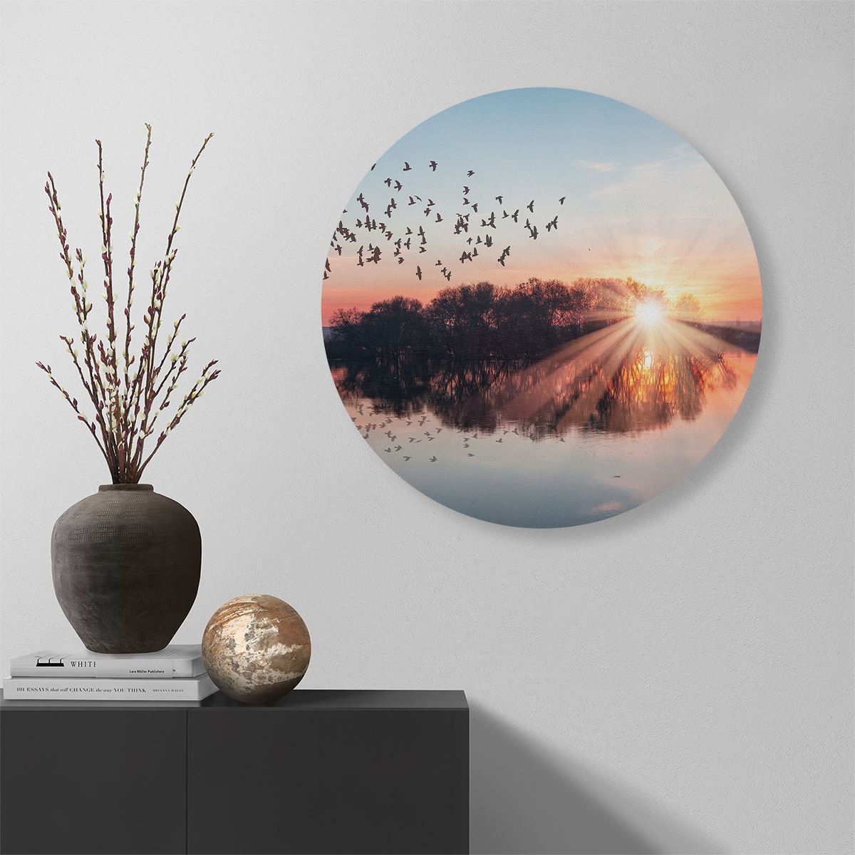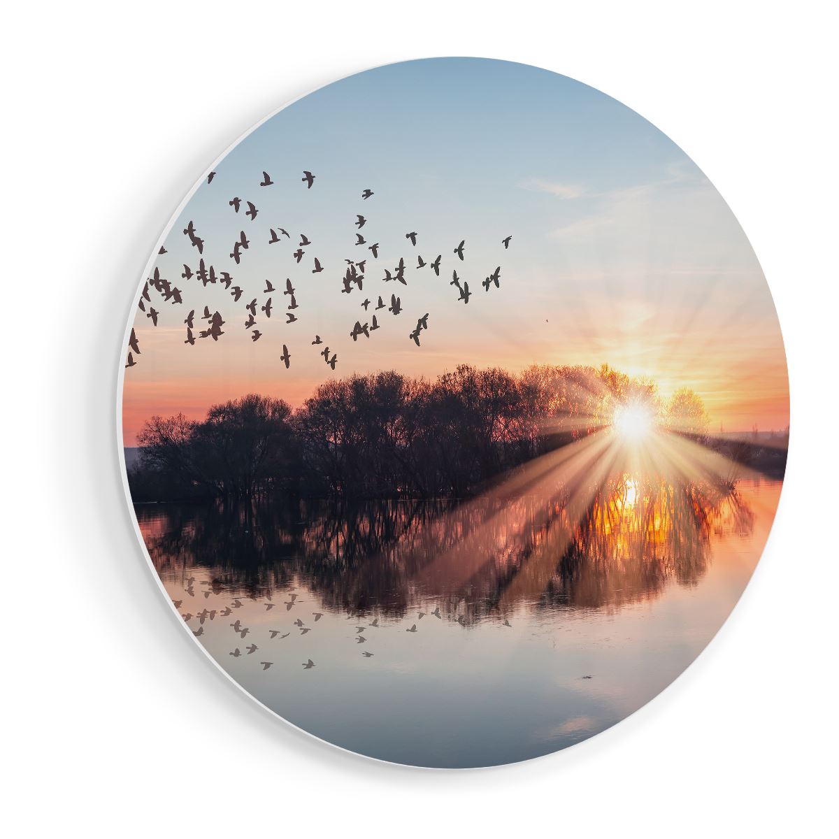 Wandcirkel Groep Vogels Boven De Meer Met Zonsondergang