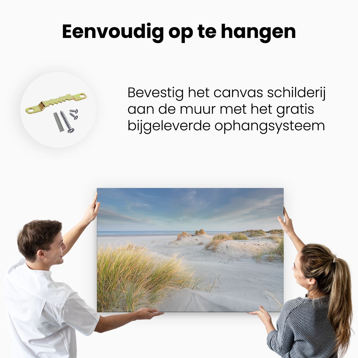 Bij aankoop ontvang je een meegeleverd ophangsysteem, zodat je op een simpele en snelle wijze het schilderij boven de bank of bed kan monteren.