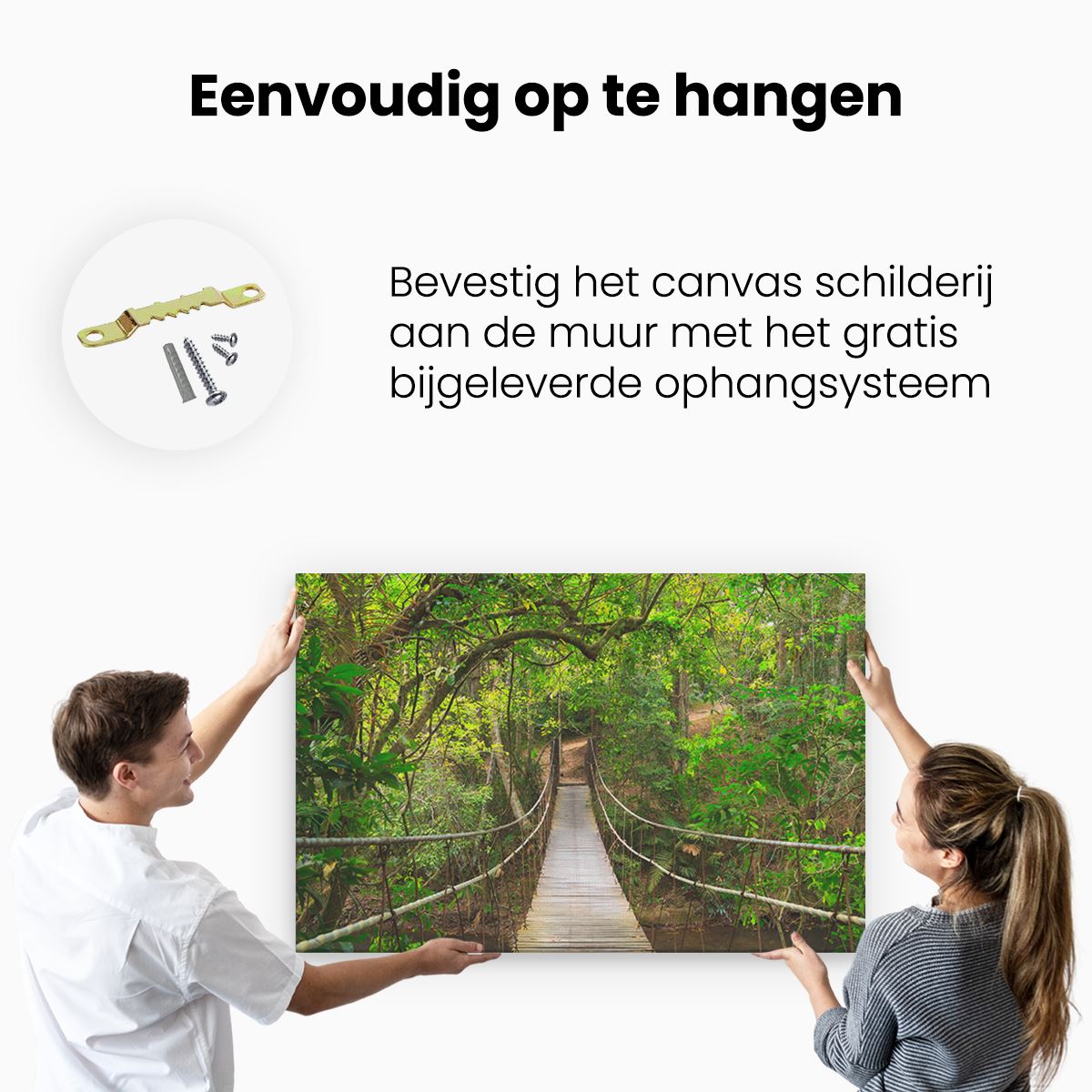 Bij aankoop ontvang je een meegeleverd ophangsysteem, zodat je op een simpele en snelle wijze het schilderij boven de bank of bed kan monteren.