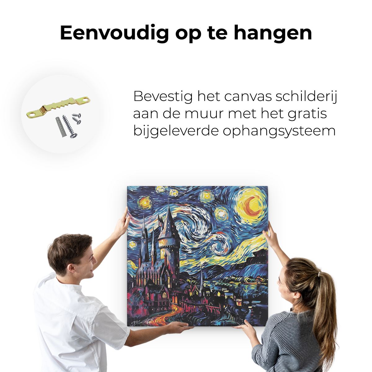 Bij aankoop ontvang je een meegeleverd ophangsysteem, zodat je op een simpele en snelle wijze het schilderij boven de bank of bed kan monteren.