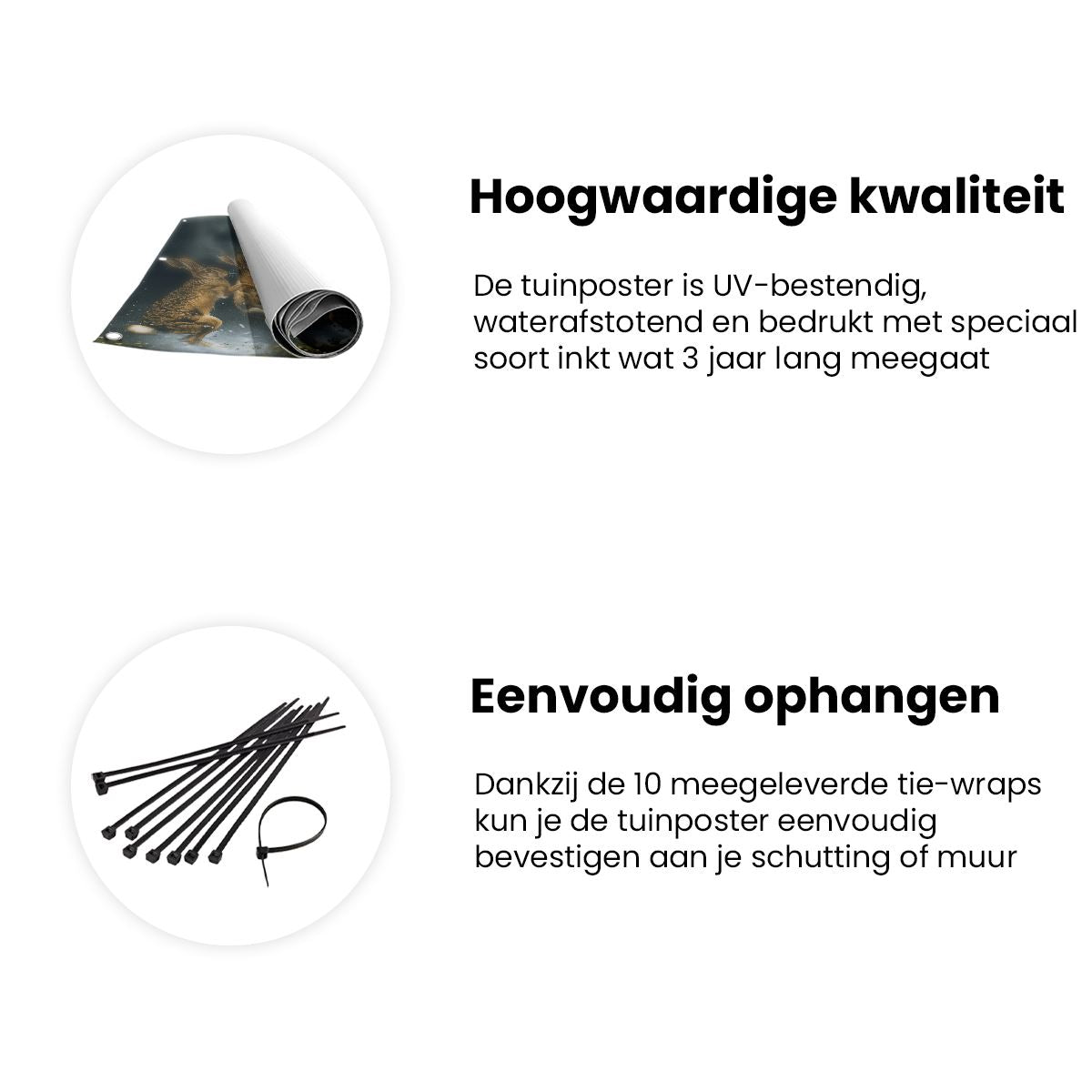 Bij aankoop ontvang je een meegeleverd ophangsysteem, zodat je op een simpele en snelle wijze de tuinposter kan ophangen.
