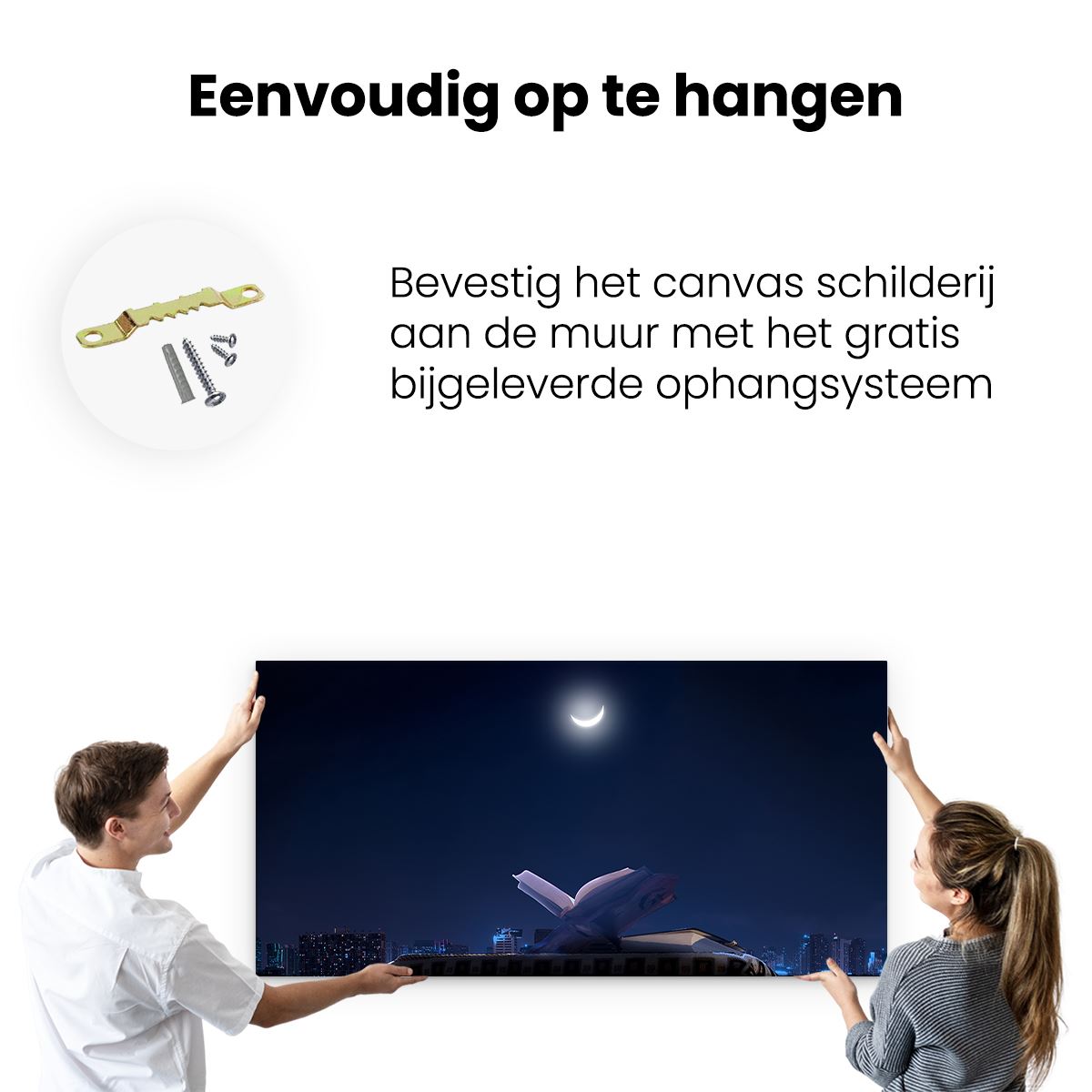 Bij aankoop ontvang je een meegeleverd ophangsysteem, zodat je op een simpele en snelle wijze het schilderij boven de bank of bed kan monteren.