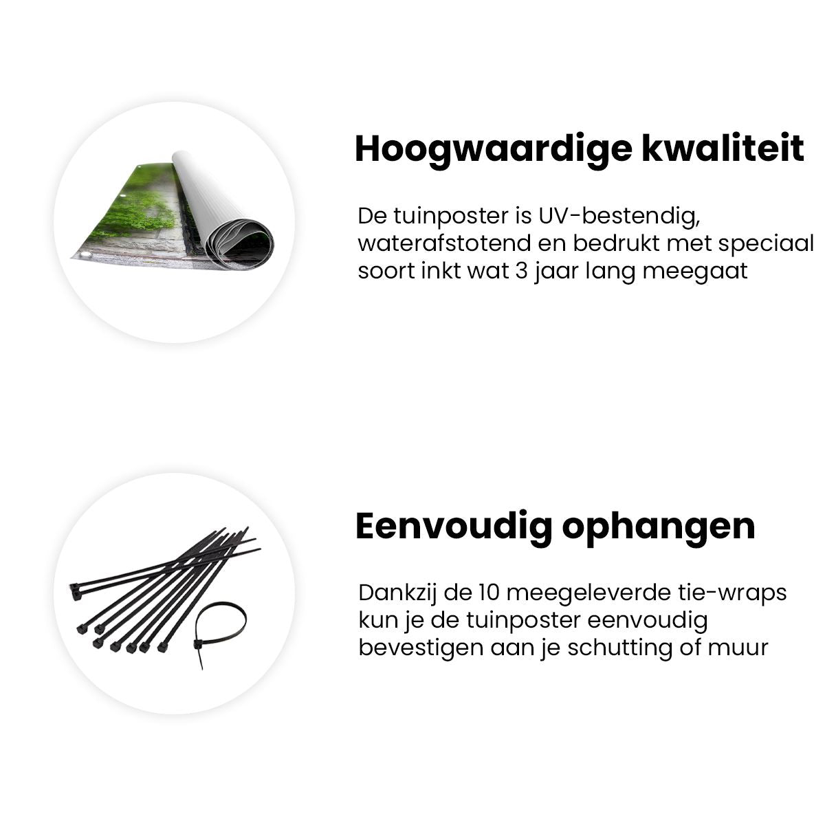Bij aankoop ontvang je een meegeleverd ophangsysteem, zodat je op een simpele en snelle wijze de tuinposter kan ophangen.