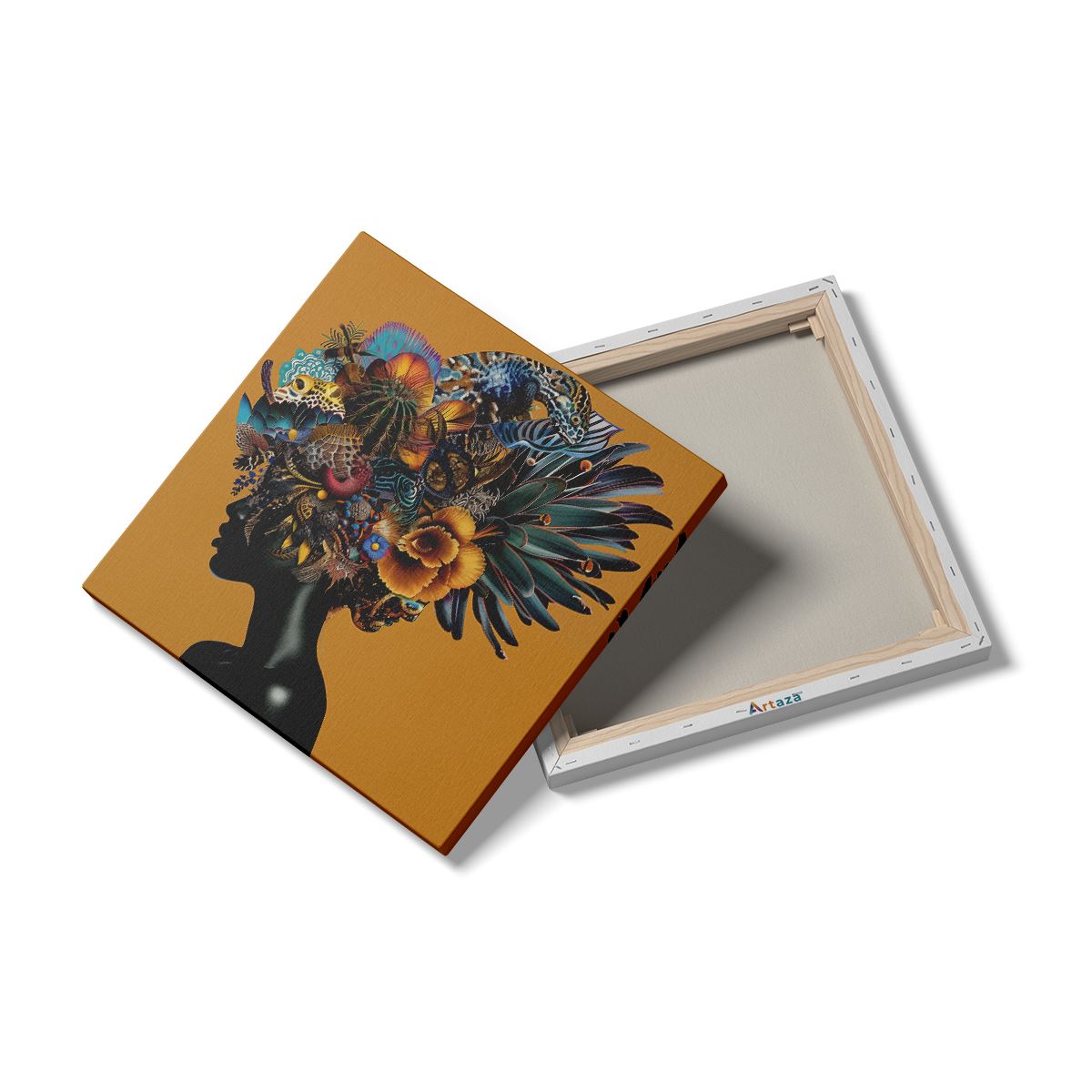 Schilderij Het Hoofd van de Vrouw zit Vol Kleurrijke Veren