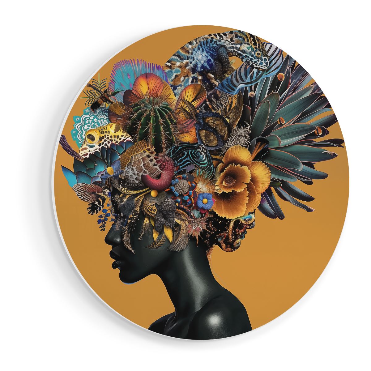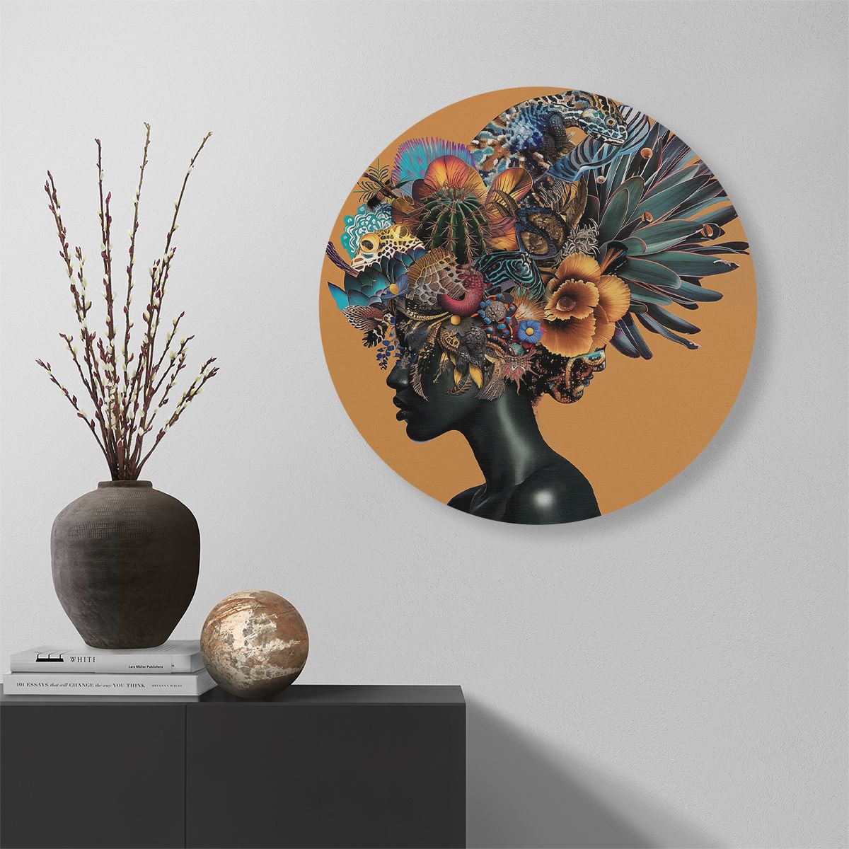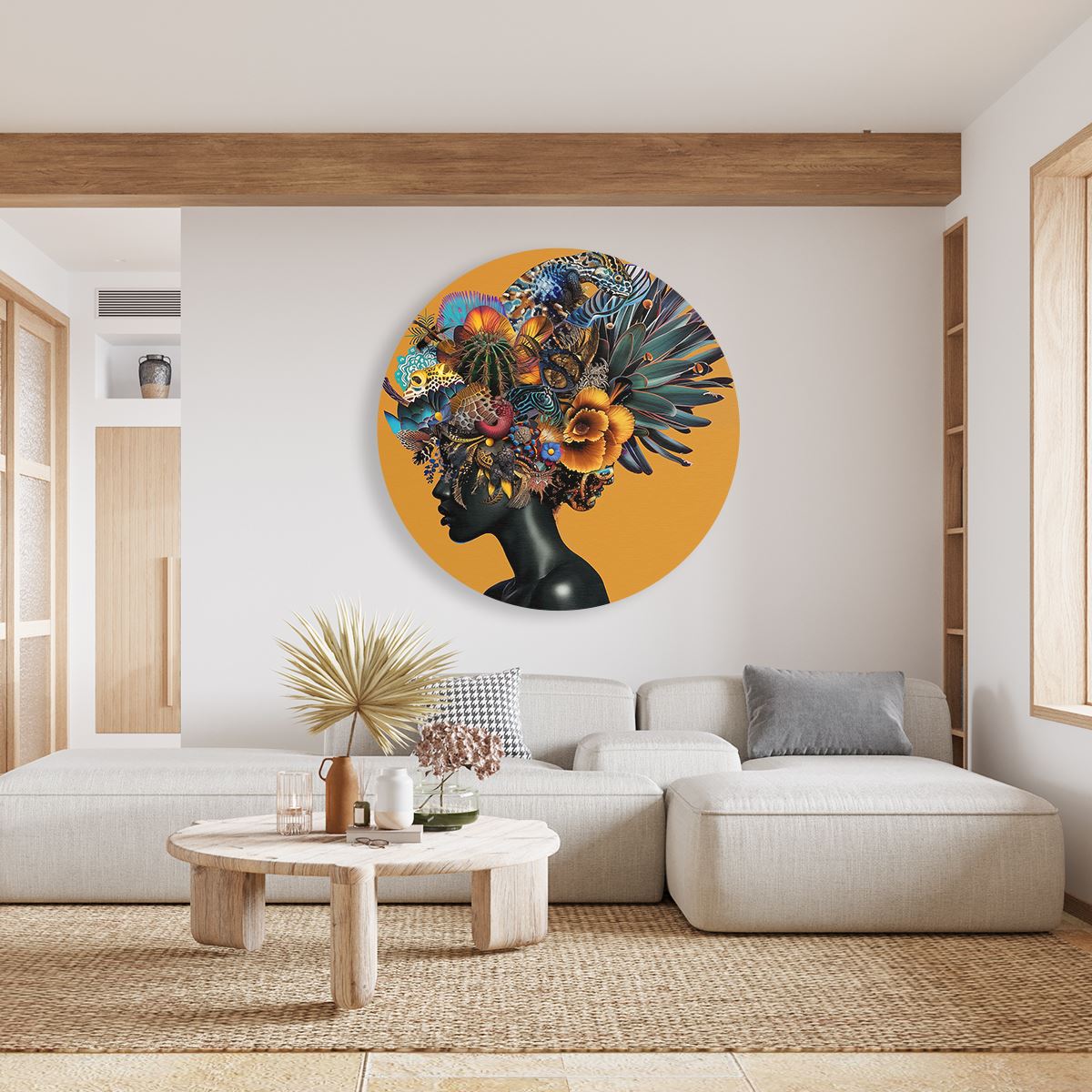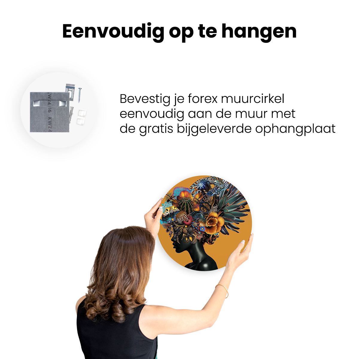 Wandcirkel Het Hoofd van de Vrouw zit Vol Kleurrijke Veren